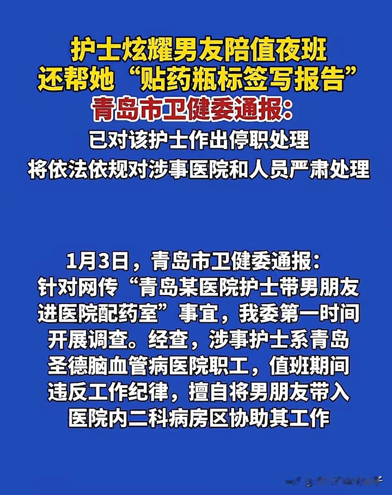 悲剧了! 青岛女护士炫耀男友陪值夜班, 后续处理结果来了,青岛卫健委通报,该护士被停职,并将严肃处理医院和相关责任人。 这下医院所有人要被她害惨了,护士长肯定是第一个被谈话的,说不定会因为管理不当,免去护士长职务,而且他们科室今年的考核评优也没有了。 两人还真是绝配,女护士腿上全是纹身,男友也是一个大花臂,真不是对纹身的人有偏见,反正我去医院不会想要这样的人给我输液。 俩人在护士站谈情说爱,还让男友去贴液体标签,真把医院当成约会的场所了,因为输错液体出的事故还少吗?