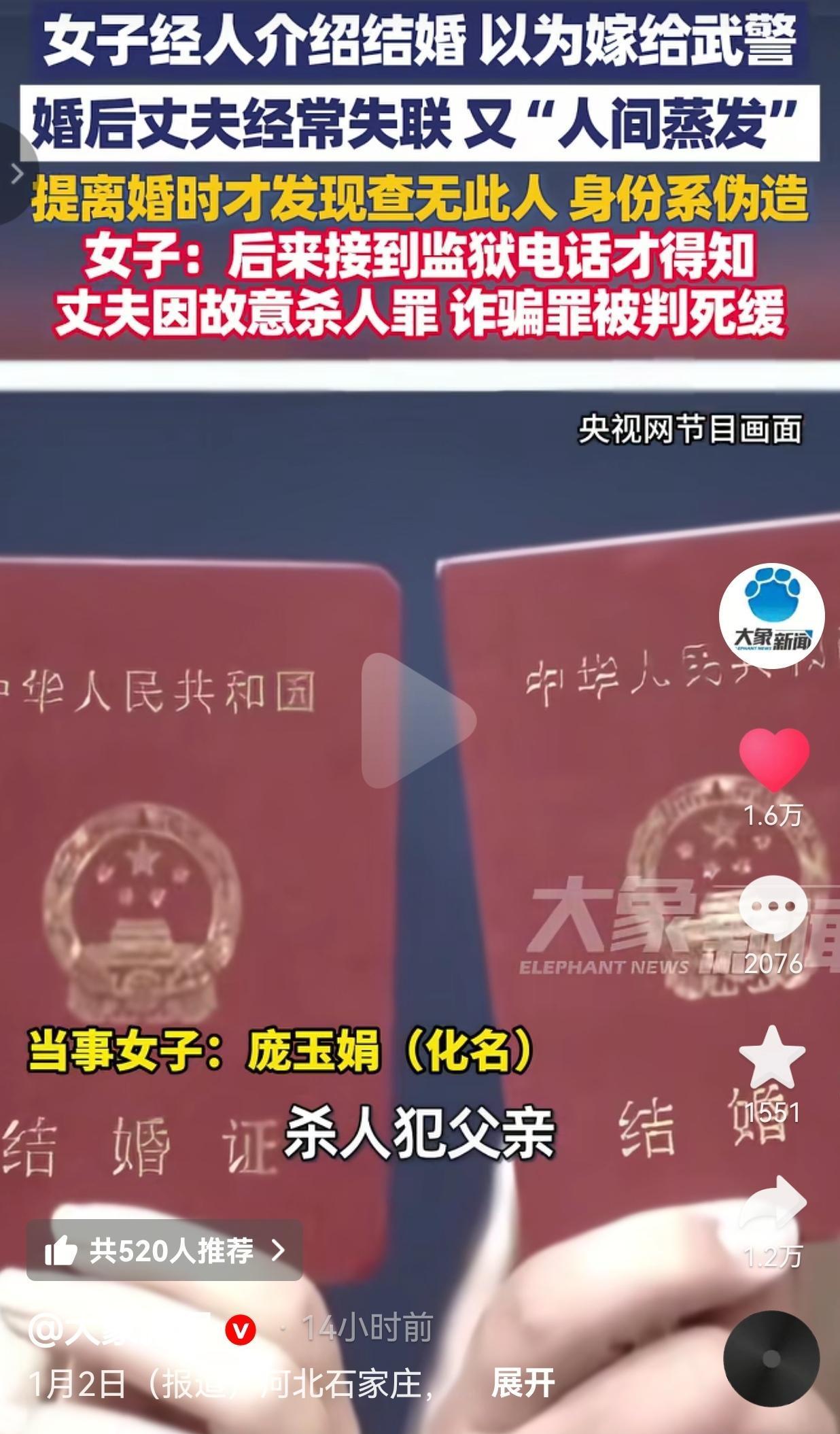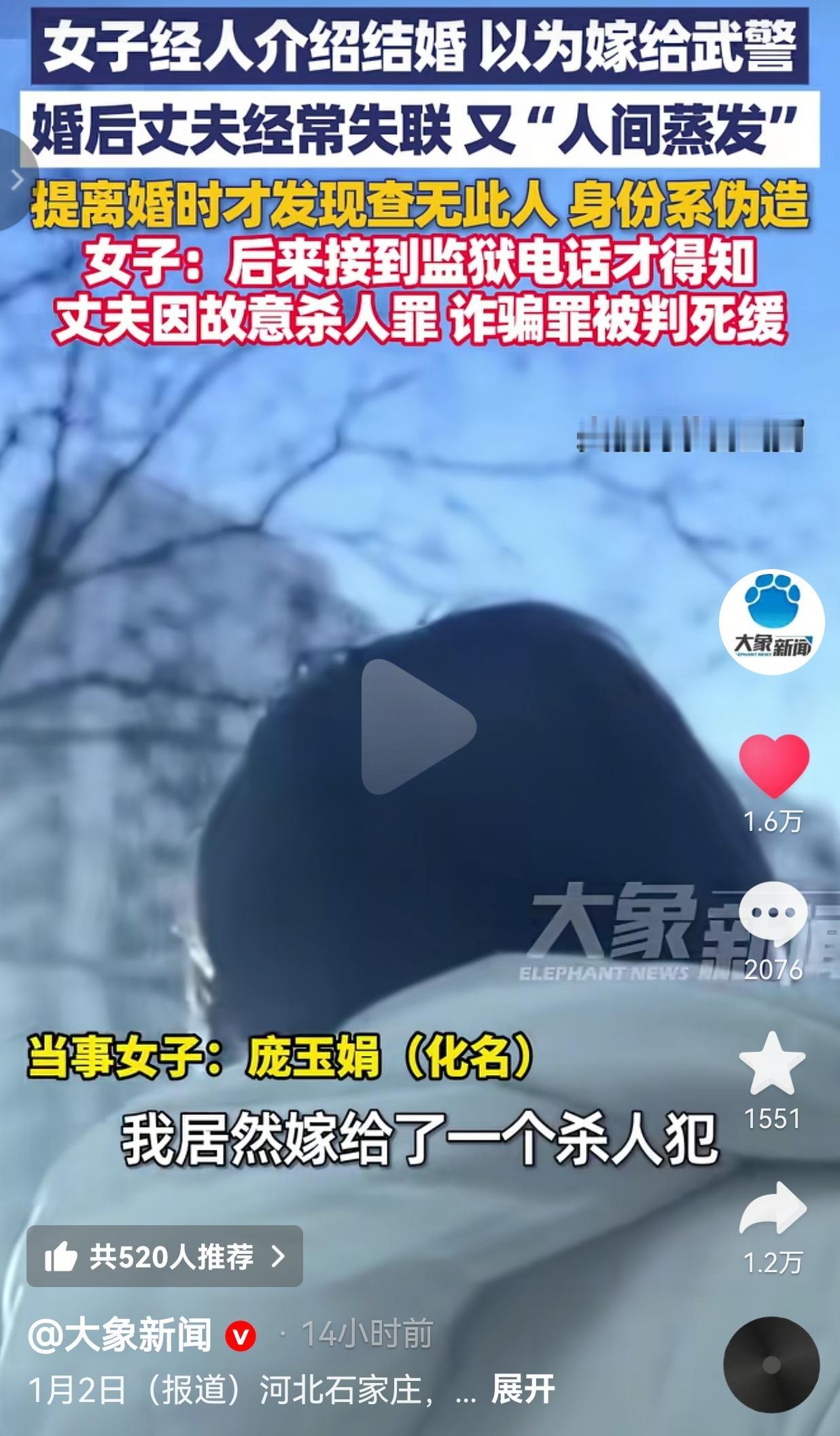 真的是离谱他妈给离谱他爸开门——离谱到家了!女子经人介绍结婚生子,以为嫁给了武警,没想到丈夫竟然是一个杀人犯。网友:结婚前一定要查清楚对方底细,这不是不信任对方,这是对自己负责! 河北石家庄,一女子名叫庞玉娟(化名),经人介绍嫁给了一名“武警上校”,本以为自己高攀了做梦也没有想到,对方竟然是个彻头彻尾的骗子。 2014年,庞玉娟经人介绍认识了“贾斌”。这人自称是武警上校,看着一身正气,庞玉娟没多琢磨,两人经过短暂的相处,没多久就和他领了证。 婚后的日子,丈夫怪得很。“贾斌”总说要去执行特殊任务,动不动就玩失联。 一开始只是偶尔不见人,后来失踪的次数越来越多,最后干脆从她的生活里彻底消失了。 这一等就是六年,到2020年,庞玉娟实在忍不了,提了离婚诉讼。 可法院查身份的时候,问题出现了,在全国户籍系统里,压根就没有“贾斌”这个人,他的武警上校身份、所有个人信息,全是假的。 庞玉娟怎么都想不通这到底是怎么回事,直到2021年11月,监狱的电话打过来,她才知道真相:这个和自己朝夕相处的丈夫,早就因为故意杀人罪、诈骗罪被判了死刑缓期两年执行。更让她崩溃的是,自己的孩子,竟然有个杀人犯父亲。 还好后来检察机关出面监督协调,民政部门把她和“贾斌”的婚姻登记给撤销了。 虽然两人的婚姻关系结束了,可是这场糟心的婚姻背后,造成的伤害,怎么可能轻易抹平呢。 网友看到后评论说:“孩子太可怜了,有个杀人犯父亲,这阴影得跟一辈子吧!” 还有的网友说:“换我我也会信啊,谁能想到有人敢伪造武警身份!” 这事听着跟电视剧情节一样,却是真真切切发生的。生活里太多人结婚只看表面,觉得对方看着靠谱就够了,偏偏忘了婚姻里最该做的,是摸清对方的身份和底细。 婚姻不能靠赌,也不能无条件信任对方,别因为一时的信任,把自己往火坑里推。识人得擦亮眼睛,一辈子的大事,要查清楚对方的身份,这样在未来就少一分风险。 (信息来源:大象新闻)