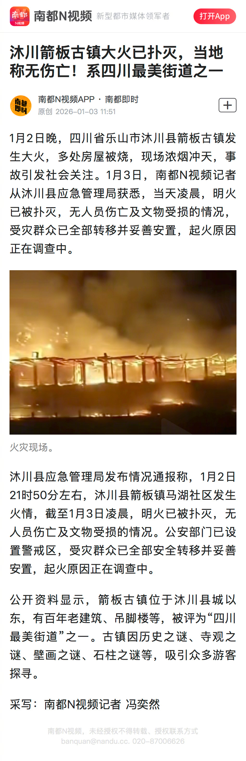 #沐川箭板古镇火灾明火已扑灭#【沐川箭板古镇大火已扑灭,当地称无伤亡!系四川最美街道之一】#应急管理局通报四川最美街道火灾#1月2日晚,四川省乐山市沐川县箭板古镇发生大火,多处房屋被烧,现场浓烟冲天,事故引发社会关注。1月3日,南都N视频记者从沐川县应急管理局获悉,当天凌晨,明火已被扑灭,无人员伤亡及文物受损的情况,受灾群众已全部转移并妥善安置,起火原因正在调查中。公开资料显示,箭板古镇位于沐川县城以东,有百年老建筑、吊脚楼等,被评为“四川最美街道”之一。古镇因历史之谜、寺观之谜、壁画之谜、石柱之谜等,吸引众多游客探寻。南都N视频记者 冯奕然沐川箭板古镇大火已扑灭,当地称无伤亡!系四川最美街道之一