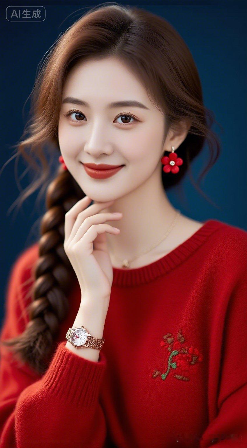 甜美少女风,红衣配花耳,温柔笑靥如花。