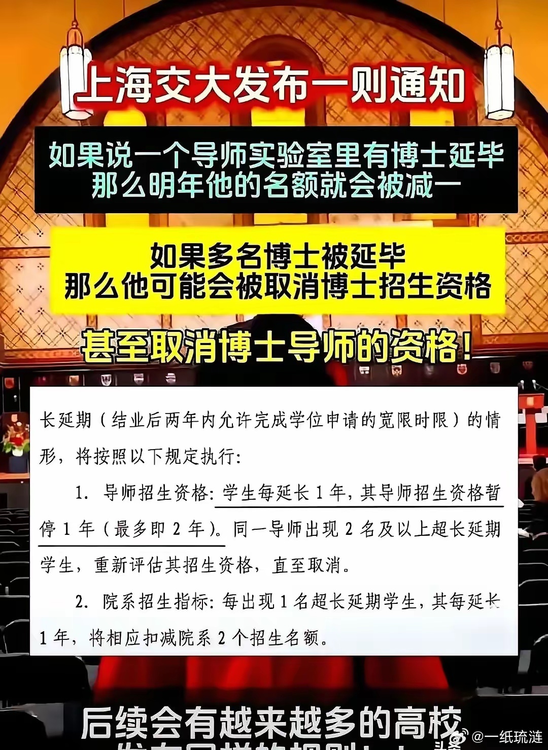 今天,上海交大所有博导的微信群,估计都炸了。一个通知,直接捅到了所有博导的命门上。说白了就一句话:你带的博士生,要是延毕一年,那你明年就停招一年新生。延毕两年,就停招两年。要是连续两年都这样……对不起,您这导师资格,咱们得坐下来重新聊聊了。这话像块石头砸进水里,群里瞬间没了声,接着私戳消息的提示音响个不停。张教授是院里出了名的“卡毕业能手”,手里三个延毕学生,当天晚上就把学生叫到办公室,把压了半年的论文初稿翻出来,红笔改了满页,说下周就提交答辩申请。李同学被卡了两年,听到消息时正在整理实验数据,手都抖了,当晚发消息问导师答辩的事,导师秒回“明天来办公室签预答辩表”。院里年轻博导更慌,把学生的毕业进度表贴在桌前,每周催一次。学生们私下群里炸开,有人说终于能按时毕业,有人调侃以后导师得求着学生。政策落地一周,延毕申请少了一半,答辩安排排到下月。其他学校学生转发消息,盼自家学校跟进。学术圈老教授也说,这招狠但有效,能治住把学生当工具的歪风。现在博导开会聊的是怎么帮学生毕业,实验室里笑声都多了。大家盼这火能烧遍更多地方,把那些乌烟瘴气的东西烧干净。