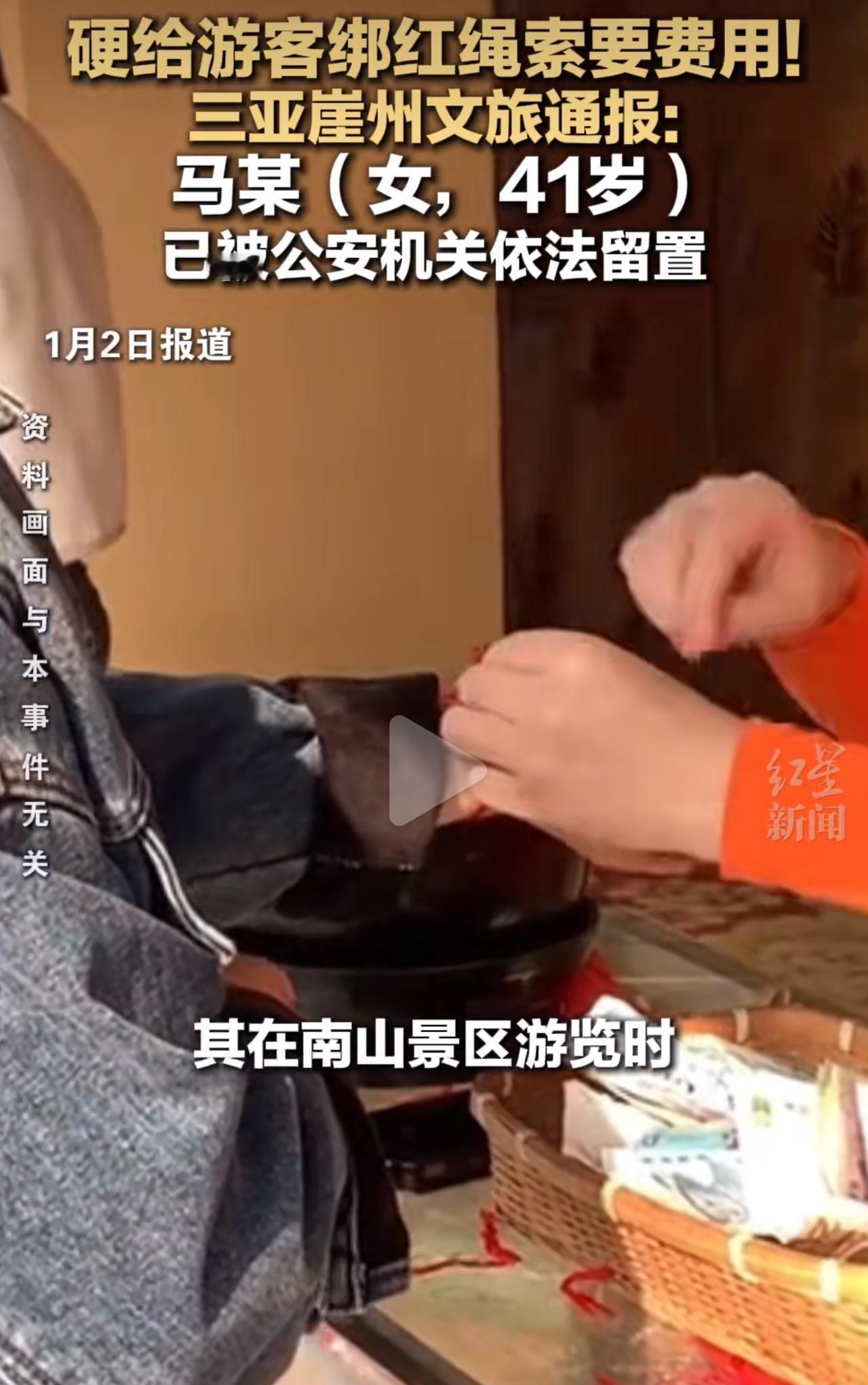 家人们谁懂啊!本来开开心心去三亚南山景区玩,图的就是个舒心惬意,结果居然遇上这档子糟心事! 一个41岁的大姐马某,二话不说直接冲上来,根本不问你同不同意,抓起红绳就往游客手腕上套。等红绳绑牢了,立马伸手要钱!这哪是什么祈福结缘,分明就是变相抢钱好吗? 换谁碰到这种事不得当场懵圈?好好的旅途心情全被搅黄了,想把红绳摘了吧,还怕被她纠缠不放。那种被冒犯、不被尊重的憋屈感,真的能让人一整天都堵得慌! 最让人想不通的是,景区里难道就没人管管吗?这种明晃晃的强买强卖能发生,明显就是监管有漏洞啊!不过还好官方反应够快,核实情况后很快就对马某采取了留置措施,还督促景区加强巡逻、设置警示标识,总算是给了游客一个交代。 不过这事还有个小插曲,不少网友都在疑惑:“留置”不是监察法里的说法吗?公安机关用这个表述是不是不太规范?其实大家纠结的根本不是一个词,而是执法的严谨性啊! 说真的,出门旅游遇到这种事真的防不胜防。我得提醒大家一句,以后在外头,但凡遇到主动搭话、说要给你“免费福利”的陌生人,一定要果断拒绝,千万别犹豫! 旅游市场想保持干净,光靠官方严查还不够,咱们游客自己也得学会主动维权。大家觉得我说得对吗?官方通报女子硬给游客绑红绳要钱 南山景区 三亚崖州区