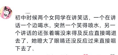 初中时候两个女同学在讲笑话,一个在讲话一个边喝水,突然一个笑得喷水,另一个讲话的还张着嘴没来得及反应直接喝进去了,她瞪大了眼睛还没反应过来直接咽下去了