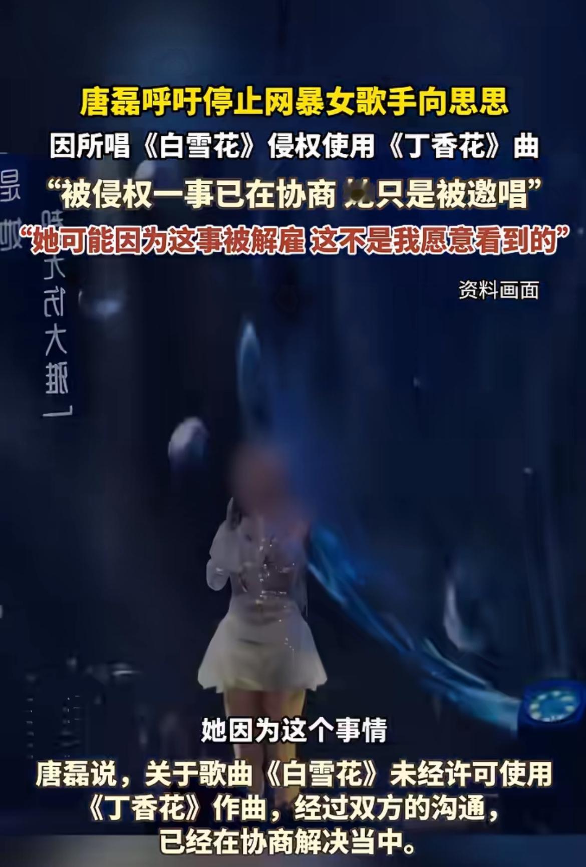最近网暴女歌手向思思 这事儿闹得挺火。2025年12月28日,《丁香花》原唱唐磊就指出向思思唱的《白雪花》用了《丁香花》作曲,开始维权。新年第一天,唐磊更新进展,呼吁停止网暴,说向思思是受公司安排演唱,双方已在协商解决。 可向思思还是因侵权被解雇了。她经纪人说她翻唱的很多歌公司都买了版权。这次可能是公司疏忽。希望大家多些宽容,也希望向思思能坚强成长,毕竟谁都可能犯错,未来好好选歌,还是能在音乐路上发光的。