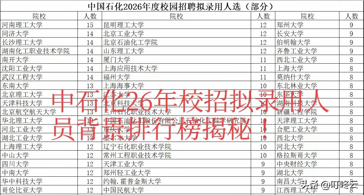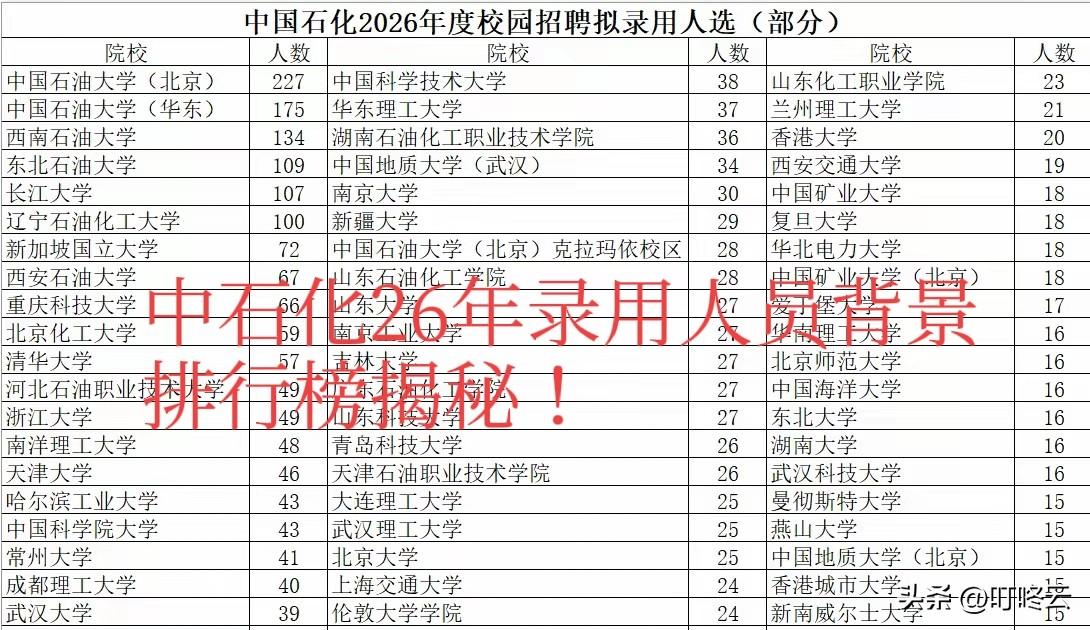 录用公示!中国石化2026年校招拟录用人员背景排行榜揭秘!前6名是石油系统内高校毕业生!第七名是新加坡国立大学毕业生录用72人!清华大学毕业生录用57人,北京大学毕业生录用25人。看来985和211,双非院校毕业生都有。学历不是万能钥匙!清华北大等985高校毕业生也没必要得瑟,考上双非院校的毕业生也不是没有机会。速速围观揭秘详细内容![点亮平安灯][点亮平安灯][福][福] 欢迎关注@叮咚云 将优先为粉丝职业规划指导,1对1咨询是付费服务,为你定制最适合的就业择业方案!欢迎留言交流讨论。[来看我][来看我] 免责声明:图片来自网络,仅供参考! 央国企求职 央国企招聘 央国企求职条件石油校招 中国石油招录 中石化面试流程 中石化秋招