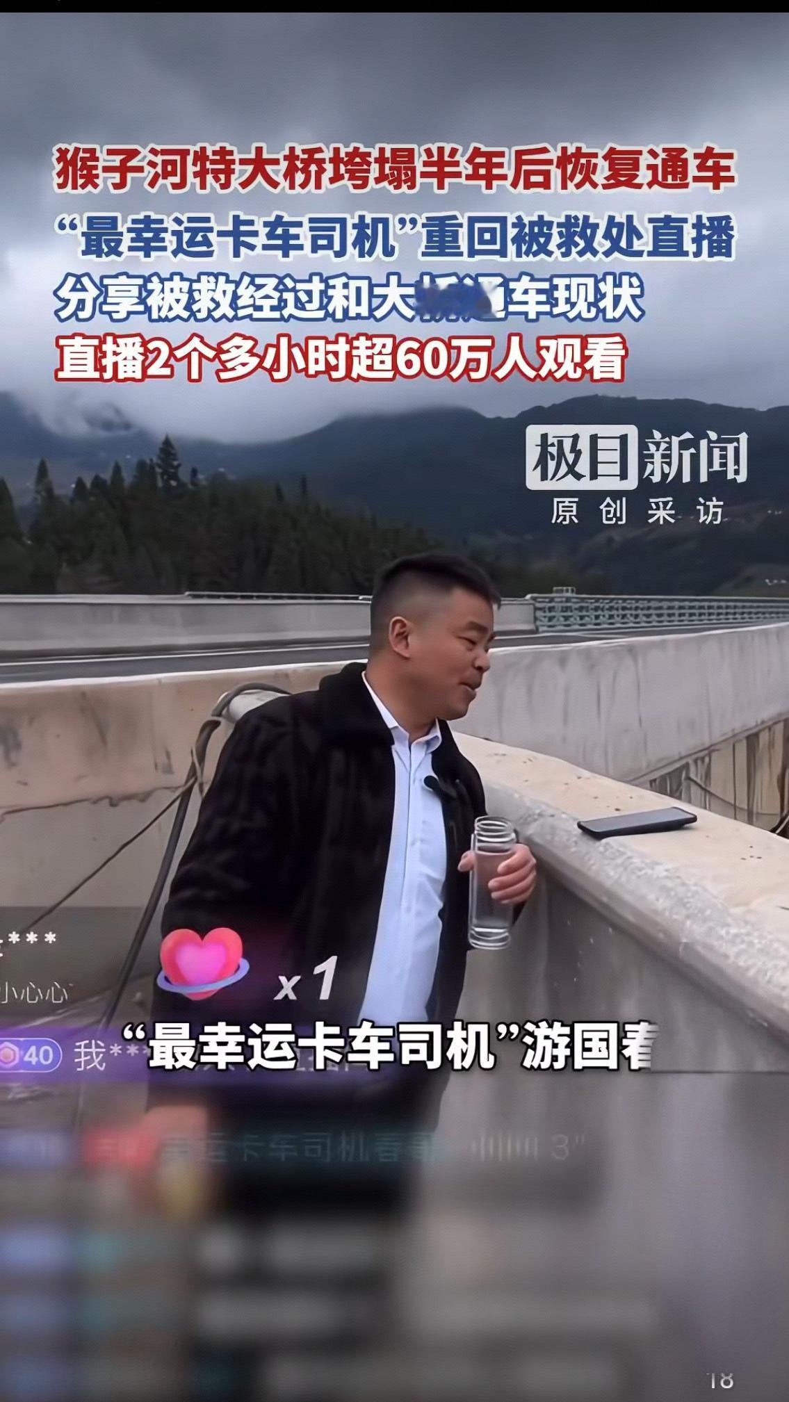60万人蹲守的直播:断桥重生,幸运司机的重逢里藏着最动人的人性之光 2026年1月1日,当第一缕晨光洒在重建后的猴子河特大桥上,一位身着蓝色工装的男子站在桥边举起手机,直播间瞬间涌入数万观众。他就是半年前在断桥处悬于30米高空、死里逃生的“最幸运卡车司机”游国春,这场跨越半年的重逢直播,2个多小时吸引超60万人在线见证,弹幕里满是“破防了”“真好”的感慨。 时间拉回2025年6月24日,持续强降雨诱发的山体滑坡,让G76厦蓉高速猴子河特大桥引桥轰然垮塌。游国春驾驶着满载22吨矿石的货车,刚驶上桥面就察觉路面下沉,紧急刹车时,车头已冲出断桥悬空。“当时脑子一片空白,只想着不能掉下去,还有后面的车不能再过来”,直播中他比划着当时的险境,声音仍带着一丝颤抖。没有手机信号,他冒着风险半开车门大喊示警,后方车主纷纷停车援手,共同筑起生命防线。80分钟后,蓝天救援队通过云梯将他救出,那一刻,他用卫星电话给妻女报平安的声音,成了最动听的牵挂。 镜头转向如今的大桥,曾经的断裂处已换成更稳固的钢箱梁结构,180多个日夜的奋战让这条交通大动脉重获新生。游国春缓缓走过桥面,手指着新修的引桥:“以前这里是悬崖,现在走起来踏踏实实,感谢建设者们的付出”。这位两个孩子的父亲,在获救后还特意从江西拉着救灾物资驰援榕江,用行动回报善意——正如村民所说,村里搞公益他总积极捐款,善良早已刻进他的骨子里。 直播间里,网友的共鸣此起彼伏:“他喊出的那声警告,救了多少家庭”“大桥重建的是道路,更是人心”“平凡人的善良和坚守,才是最珍贵的”。有人分享自己的遇险经历,有人致敬救援人员和建设者,满屏的正能量让人热泪盈眶。这场直播之所以动人,不仅是因为死里逃生的幸运,更是因为它让我们看到:危难时的互助、困境中的坚守、重建后的希望,这些人性的光辉远比钢筋水泥更坚固。 从断桥悬空到大桥重生,从孤身遇险到万人牵挂,游国春的故事告诉我们:幸运从不是偶然,而是善良与勇敢的双向奔赴。当善意传递、微光汇聚,就没有跨不过的难关,没有修不好的“心灵之桥”。