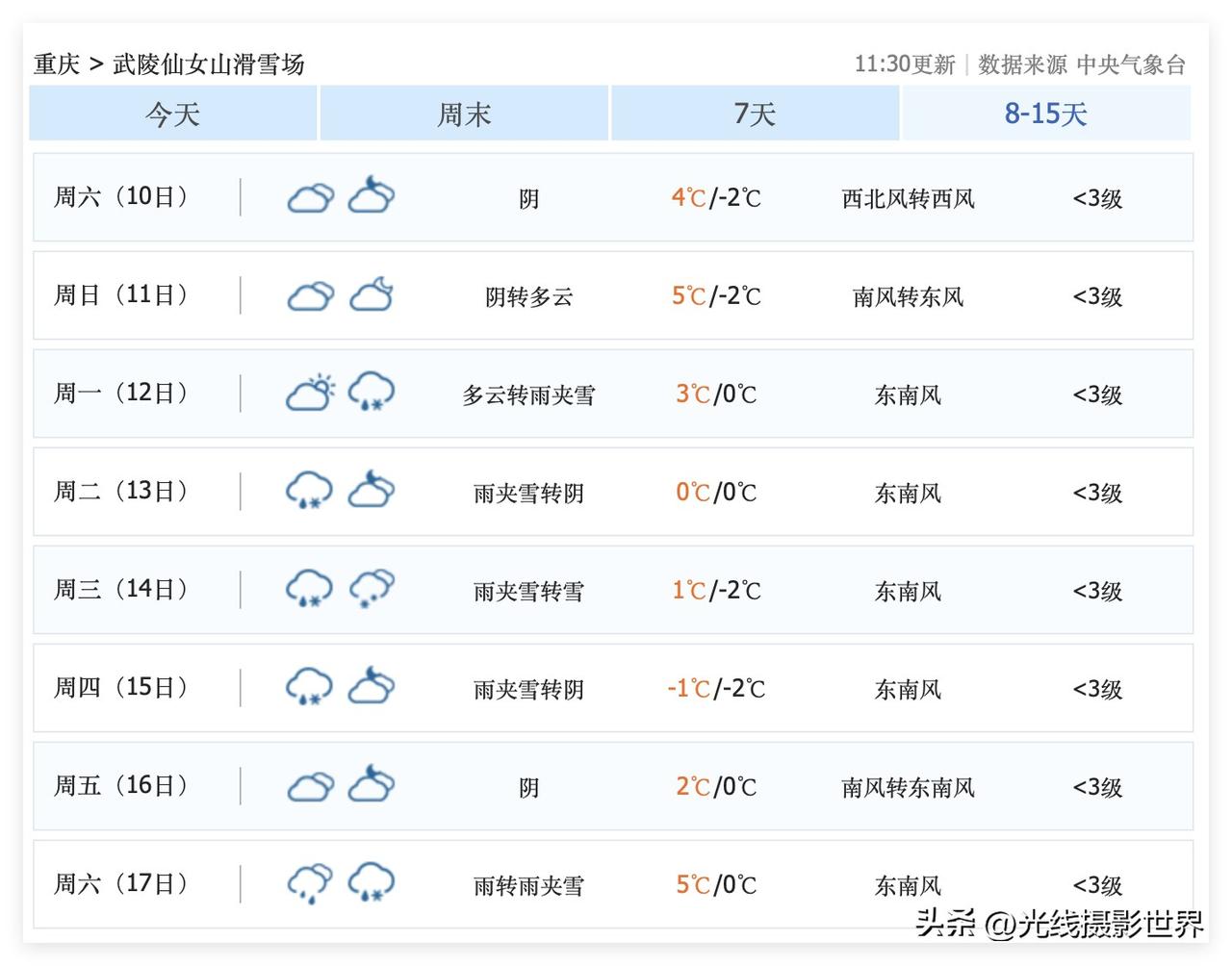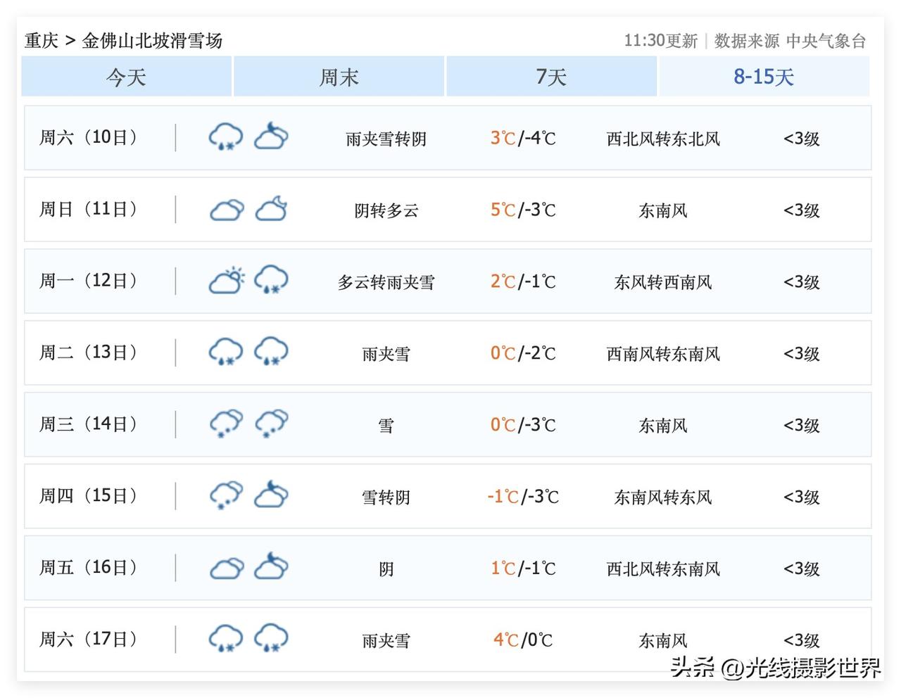 哎!1月3日,重庆主城区,太冷了!今年最冷的一天啊!不过,好消息是,1月4日,重庆不下雨啦!1月5日,重庆要出太阳啦!1月5日到11日,重庆主城区,不下雨,气温快速回暖,最高气温将会回到14度……啊啊啊!这个元旦节,重庆凄风冷雨,我快要被冻死了啊! 这个元旦节,重庆仙女山、金佛山、南天湖、南天门、山王坪、风吹岭……下雪啦! 1月4日开始,重庆的雨雪天气就要告一段落啦! 不过,超级计算机认为,1月12日到17日,新一轮雨雪天气来袭…… 1月14日和15日,重庆仙女山和金佛山,有可能再次下雪! 好吧,那就我就……也许,我会1月14日或者15日去仙女山看雪玩雪滑雪……仙女山啊!