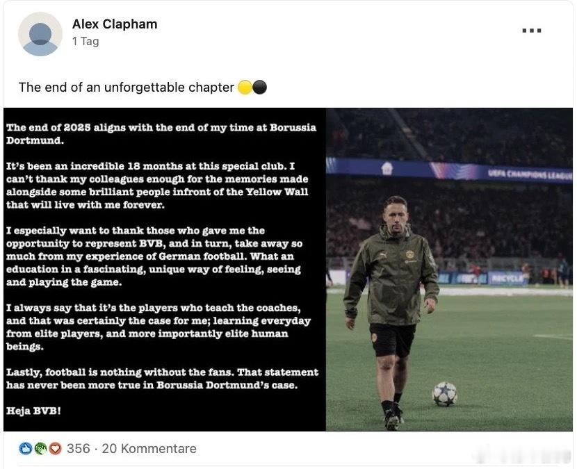 多特蒙德定位球教练克拉彭在俱乐部之前,就在领英公布了自己离开的消息,他在多特蒙德工作了一个半赛季。当初是沙欣邀请这位英国教练来到多特蒙德,首先是作为技术教练,科瓦奇到来后让他负责定位球。此前多特蒙德在德国杯输给勒沃库森,角球占据压倒性优势却没有好的表现,就引起媒体媒体关注。在德甲层面,多特蒙德表现还可以,26个进球有8个来自定位球,排名德甲第六。12个丢球4个来自定位球,仅仅多于莱比锡。科瓦奇则表示克拉彭的合同本来还有半年就要到期,双方是友好分手。