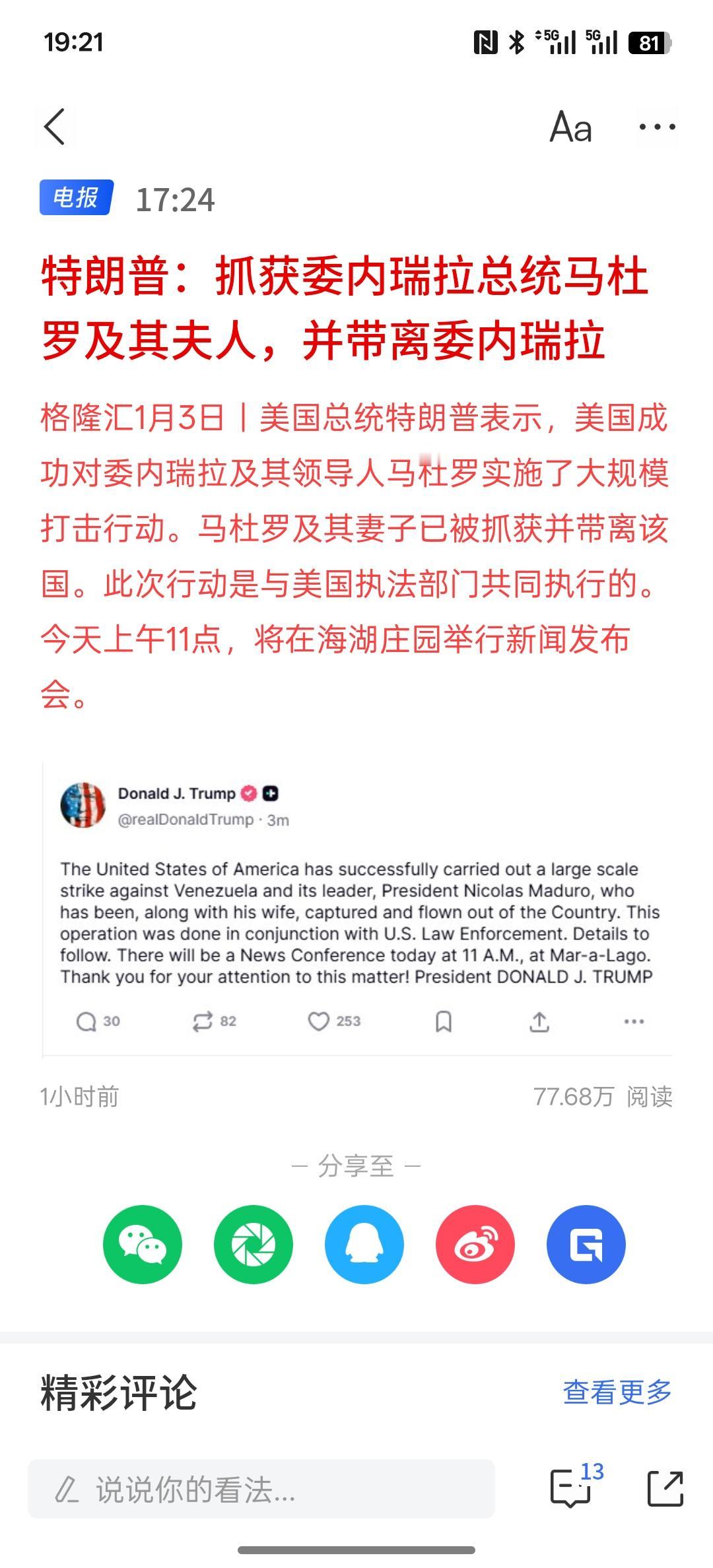 美国对委内瑞拉空袭一个小时,特朗普:抓获委内瑞拉总统马杜罗及其夫人,并带离委内瑞拉,现在委内瑞拉整个国家应该处于一个混乱的状态,那马杜罗的夫人已经被带走,大概率整个家族可能被美国一锅端掉!现在委内瑞拉内部应该是相对比较混乱的!在美国强势的军事武器装备的压力下,委内瑞拉撑不了多久!对上美国根本就没有任何的胜算!所以最后该要不了多久,委内瑞拉就得服了!毕竟委内瑞拉是美国后花园的地盘!走不掉的国家!只有美国来支配!为了整个国家也别无选择!