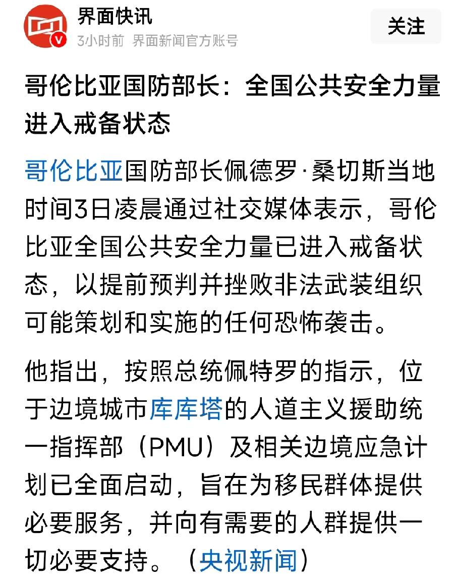 哥伦比亚国防部部长宣称:全国进入戒备状态。这难道接下来轮到哥伦比亚了,哥伦比亚总