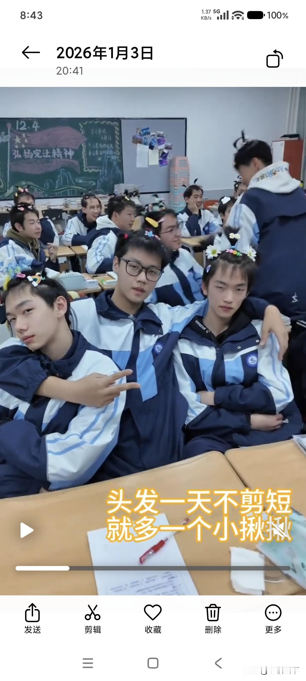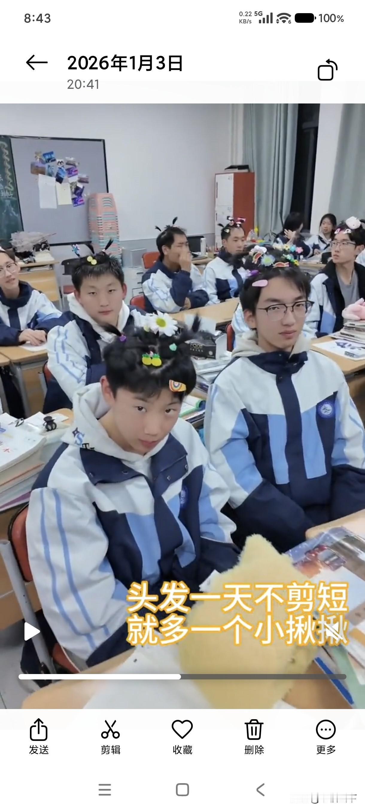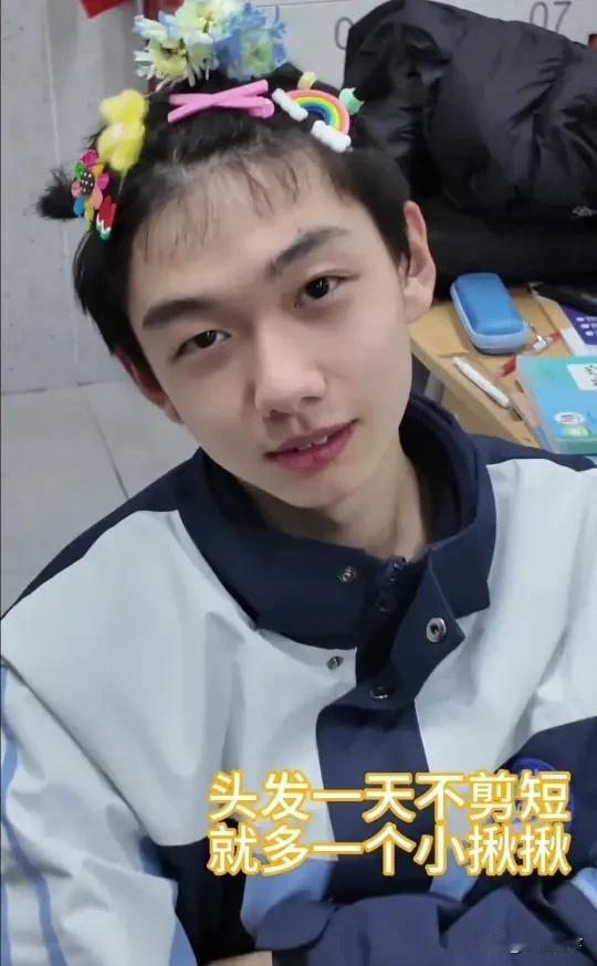 男生不爱剪头发,那就一起扎小辫儿!头发一天不剪短,就多一个小揪揪。最近一段教室视频在网上火了,画面里一群高中男生的头上扎满五颜六色的小揪揪,别着花里胡哨的发卡,有的一脸生无可恋,有的还故作潇洒地搭着兄弟的肩,反差萌直接戳中无数网友的笑点。 据了解,这群男生因为迟迟不肯按学校要求剪短头发,班里的女生索性想出了这个“奇招”——你不剪,我们就帮你“打扮”。于是彩色皮筋、卡通发卡全往男生头上招呼,原本略显叛逆的“留发抗议”,愣是变成了一场全班参与的趣味闹剧。镜头里,男生们顶着造型各异的小揪揪,却没有一人真的生气,甚至有人偷偷对着镜头比耶,青涩又鲜活的同学情谊藏都藏不住。 这一幕让无数网友直呼“爷青回”:谁的青春里没有过这样调皮又温暖的瞬间?比起刻板的校规说教,同学们用这种轻松的方式化解小矛盾,反而让“剪头发”这件事变成了青春里的趣味插曲。有人说,这才是校园该有的样子,没有针锋相对的对抗,只有一群少年用最可爱的方式彼此陪伴。 其实青春从不是被规训成一模一样的模样,而是这些打打闹闹、彼此迁就的瞬间,才拼凑出独属于少年的鲜活与热烈。看着这群男生顶着小揪揪的模样,突然懂了:最好的校园时光,从来不是整齐划一的发型,而是身边有一群陪你闹、陪你疯的人。 你上学时有没有过这样搞笑又暖心的班级趣事?评论区说说你的青春名场面吧!