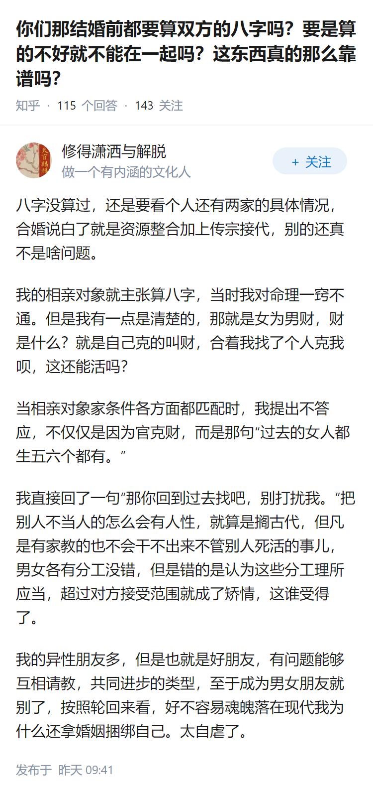 你们那结婚前都要算双方的八字吗?要是算的不好就不能在一起吗?这东西真的那么靠谱吗?