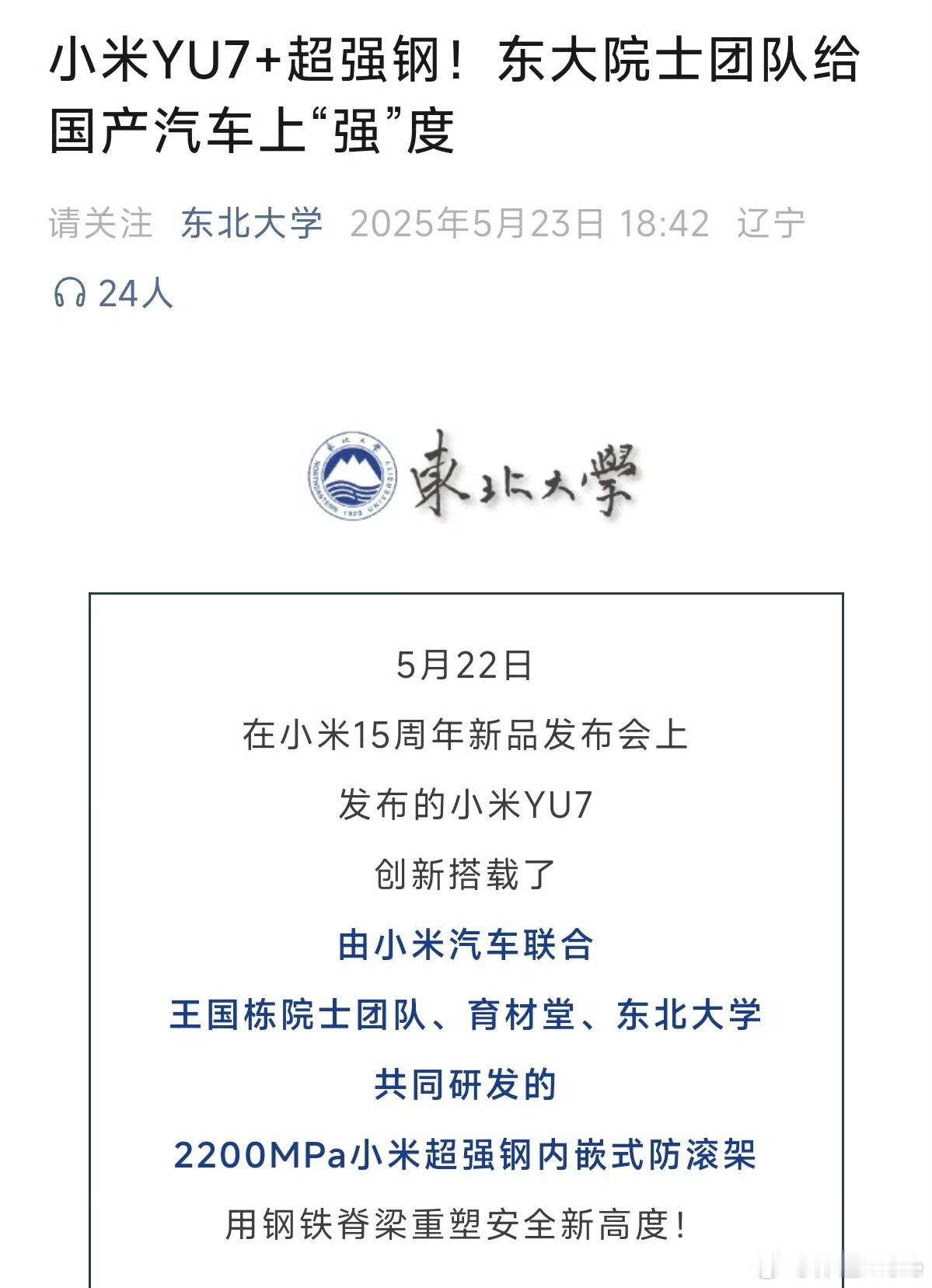 雷军回应小米超强钢争议小米超强钢是小米和王国栋院士团队、育材堂、东北大学共同研发的2200MPa小米超强钢,率先应用于小米YU7,是目前行业最领先的之一。这是实打实的可以测出来的强度,至于命名也是行业惯用做法。小米也不怕专业机构和专业媒体来测小米超强钢的抗拉强度。甚至如果有机构和媒体需要,小米还可以提供样品。其实刚开始我也不懂为啥有人带小米超强钢的节奏,后来我明白了,他们看不得小米能创新,看不得小米能当行业领头人,就是要给小米泼脏水。小米这次直播拆解表现了一种底气,欢迎你来拆解用事实说话。