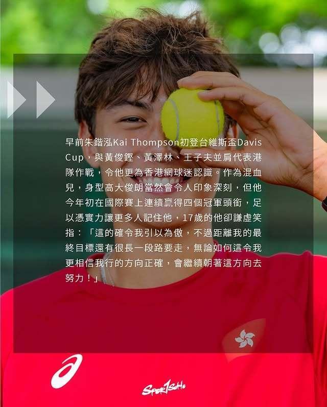 2008年7月25日出生的中国香港网球新星朱鍇泓(Kai Thompson)将迎来巡回赛首秀,明天在ATP250中银香港网球公开赛资格赛首轮登场,对阵美国选手纳瓦,此外他还将搭档周意出战男双。关注一下~网球体育大赏网球talking大会