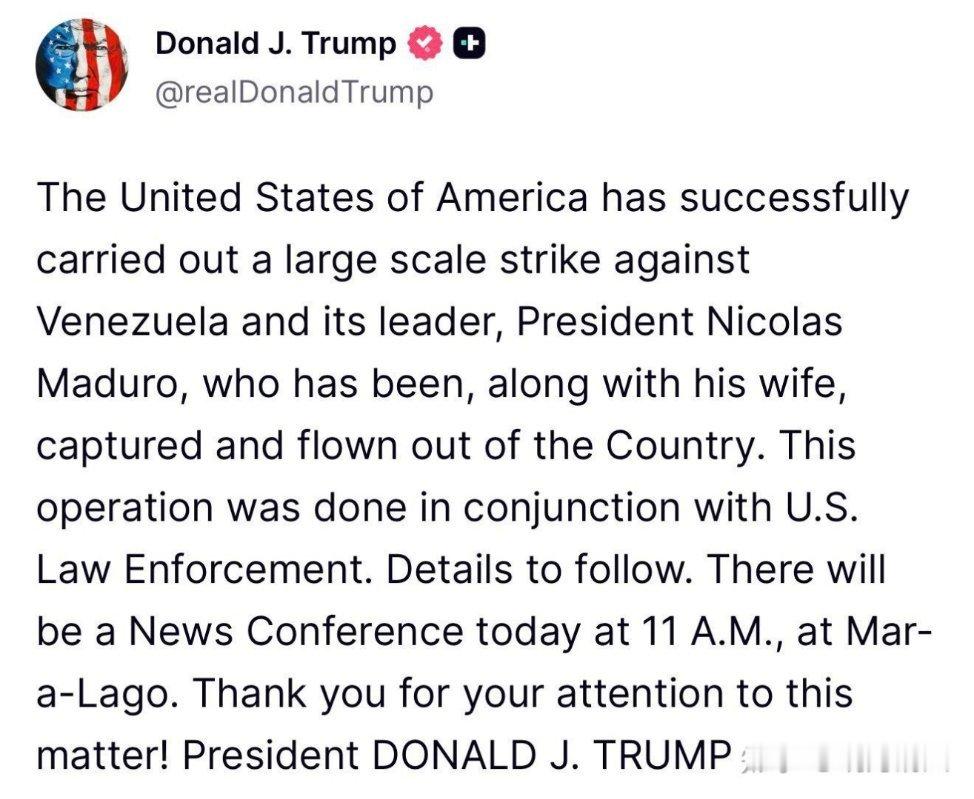 特朗普称已抓获委内瑞拉总统这波三角洲全责。特朗普说11点还要开发布会,不知道会不会把马杜罗给弄来当场宣布个罪名啥的。老马啊,你也太不小心了。