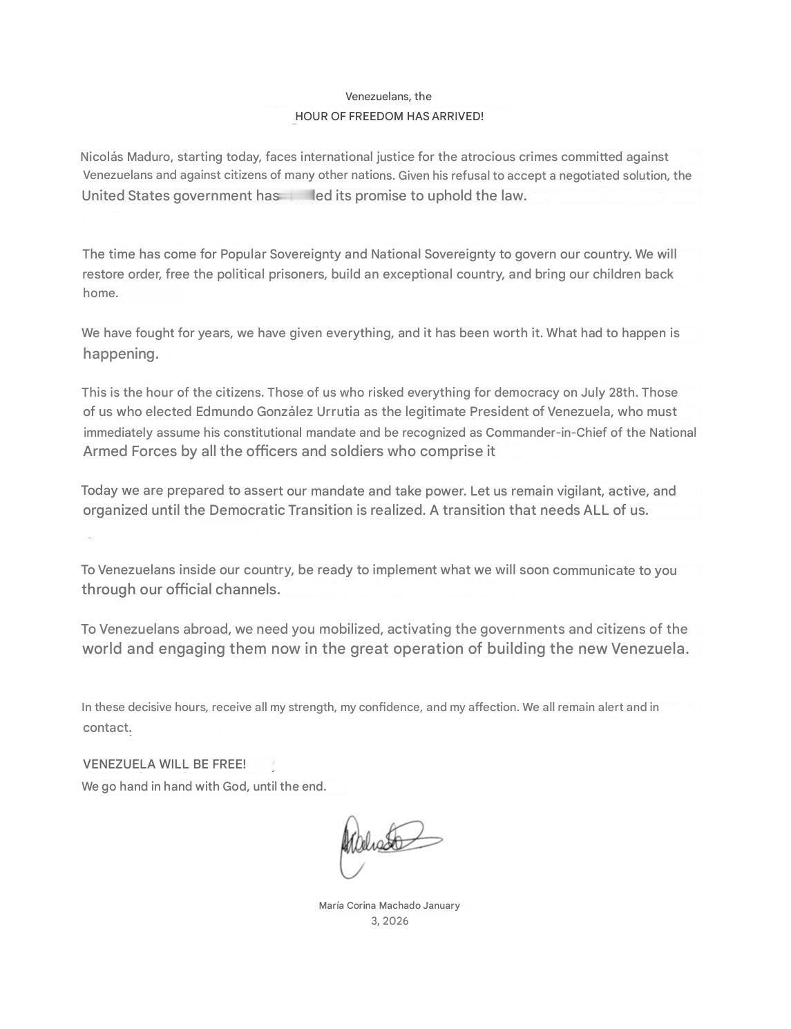新闻快讯——马查多发表声明:“美方践行了维护法律的承诺。” “鉴于(马杜罗)拒绝接受协商解决方案,” 埃德蒙多·冈萨雷斯“必须履行其宪法赋予的职责”。