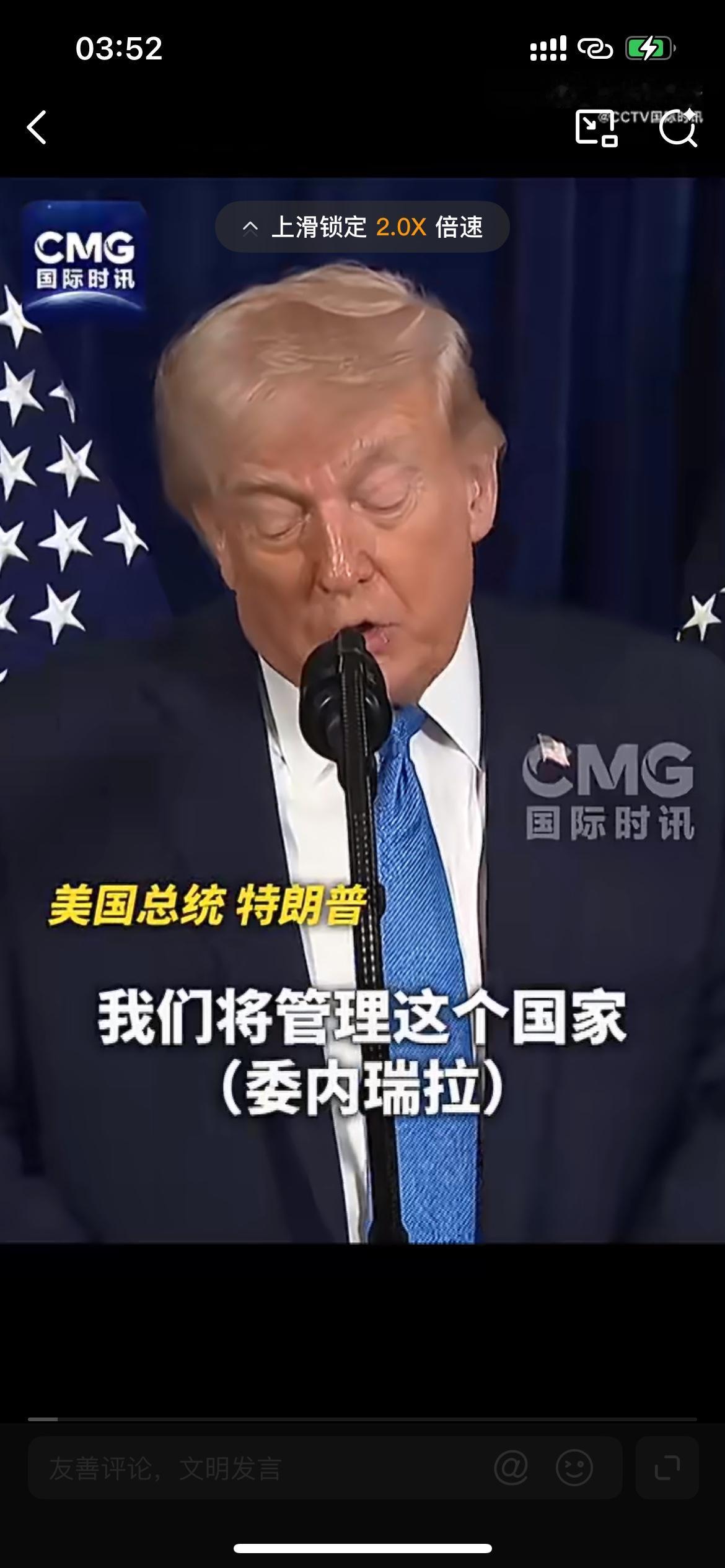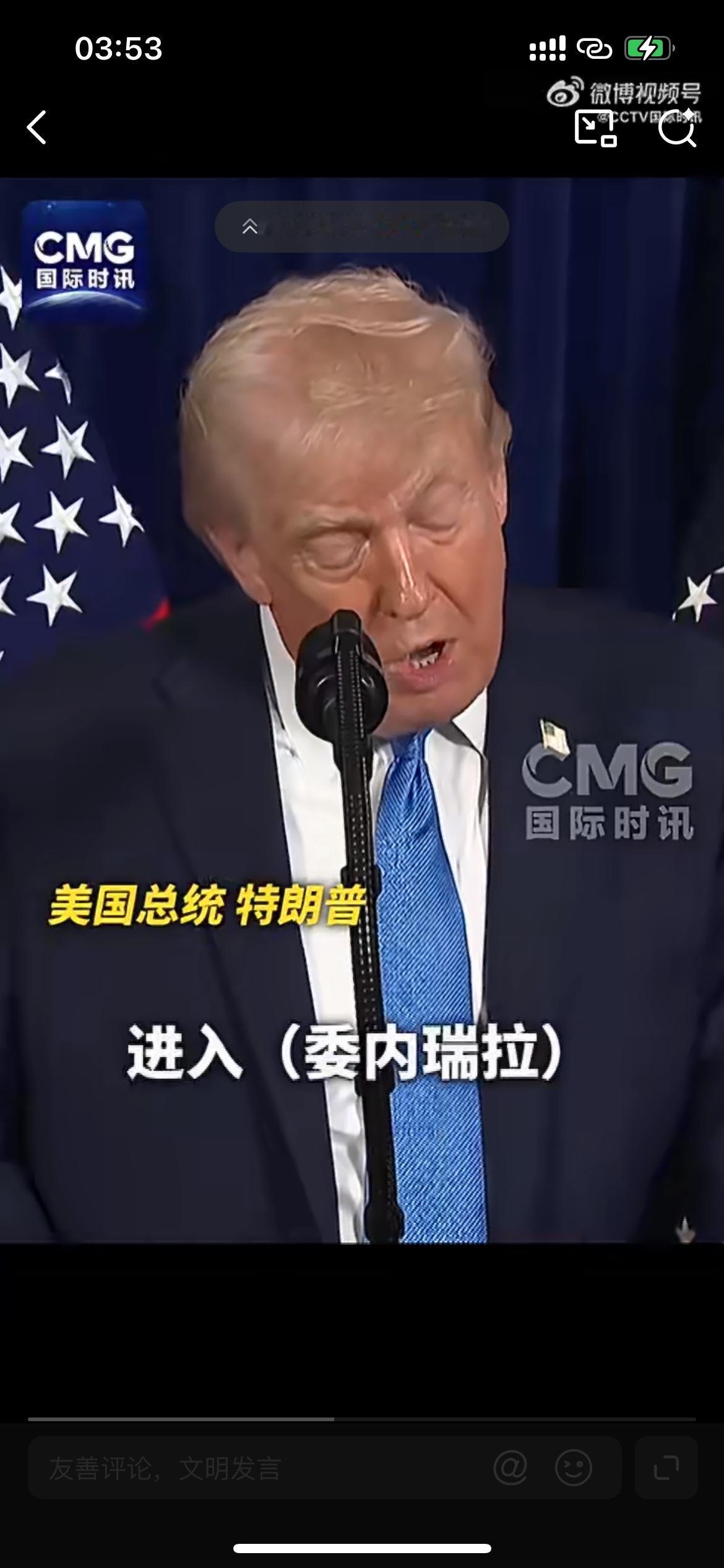 赤裸裸的侵略战争!特朗普称,将占领管理委内瑞拉! 当地时间1月3日上午,北京时间今天(1月4日)凌晨,特朗普举行记者会。宣称,美国将“管理”委内瑞拉,直到能够进行一次安全、妥当且审慎的权力交接。他没有为美国的占领设定时间限制,“何时将委内瑞拉交还给委内瑞拉人将由美国决定”。 他还谈到了石油,声称将让美国大型石油公司进入委内瑞拉修复基础设施,“开始为委内瑞拉赚钱”。 特朗普称,原本认为需要发动第二波行动,但现在看来可能不需要了。但是如果有必要,美国已准备好发动第二轮攻击。 可以说,美国又一次释放淫威,但世界绝不会被美国吓倒,一个负债累累的国家,他哪来的自信和勇气挑战国际秩序。可以说,美国作死,也离死期不远了!这也再次证明:世界还是一个弱肉强食的时代,武力仍然威胁世界和平与安全。世界爱好和平的国家必须团结一致,坚决铲除美国霸权这个毒瘤!