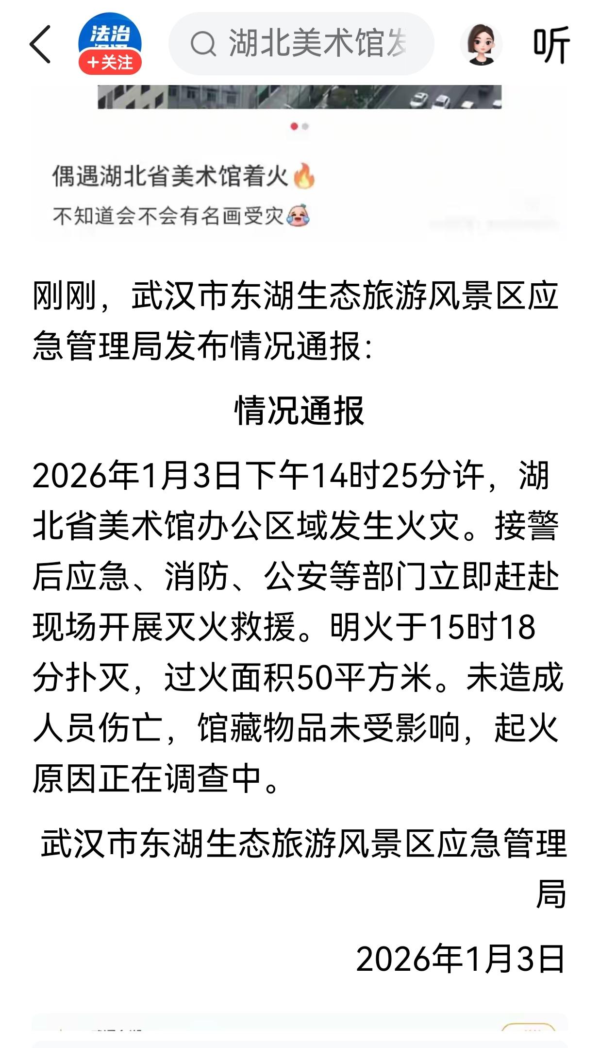 1月3日下午14时25分左右,湖北美术馆发生大火,明火在15时18分左右被扑灭。 根据武汉市东湖生态旅游风景区应急管理局通报显示:总共过火面积约为50㎡,没有人员伤亡和馆藏物品受到影响,事故原因还在调查中。