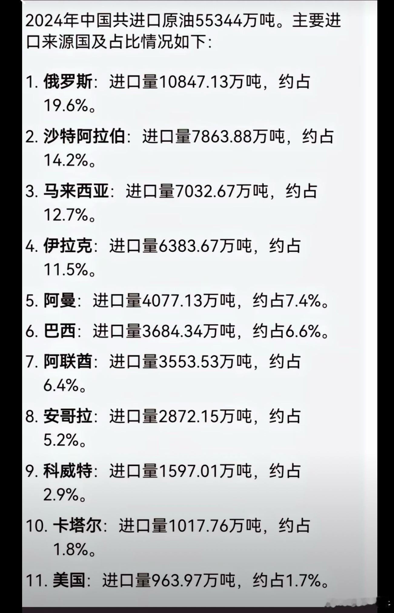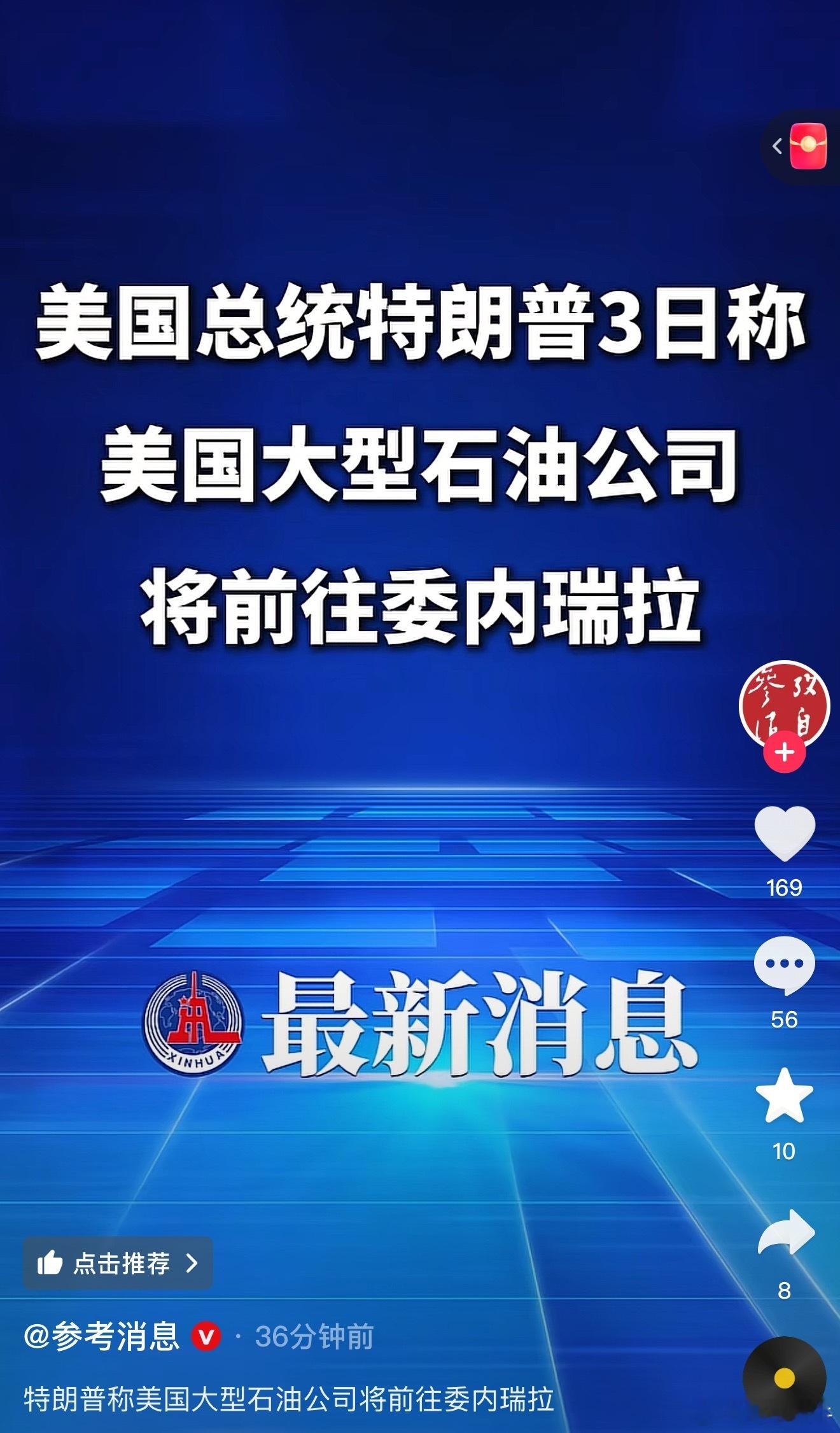 特朗普刚说美国大型石油公司将前往委内瑞拉哇靠,真的是演都不演了,直接明抢了,六个小时之内啊,抓人家总统接管人家家里的石油产业,这抢的也太快了吧,这效率有点高呀!0元购的根找到了吧!巴菲特看来是早知道,我记得好像提前买了原油多少虽然委内瑞拉是中国的6个全天候战略合作伙伴之一,但去年总共就五十多亿美元。去年我们进口石油的第一名是俄罗斯,第二是沙特,第三是印尼就是伊朗转口得,第四是卡塔尔,第五伊拉克,第六是非洲的一个国家,委内瑞拉才是我们进口石油的第十一名。目前看,最大的影响就是CNY的国际化受阻了,任重而道远啊!特朗普称已抓获委内瑞拉总统