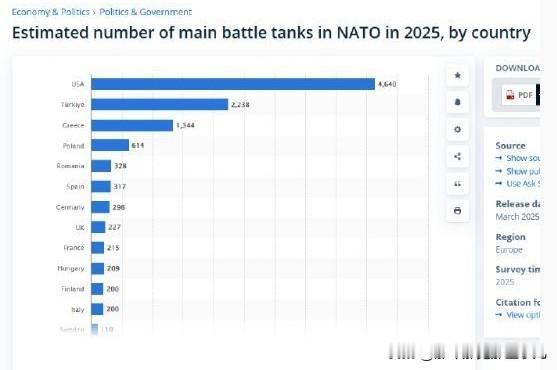 巴尔干火药桶这一块.. 2025北约各国主坦克数量: 第一是老美, 第二居然是土耳其!? 第三居然是希腊!!? 为啥第二第三这块囤积这么多... 如果去看下希腊陆军的分布你会发现,希腊所有的师旅级单位全部丢在希土边境上摆一字长蛇阵,甚至雅典都没留部队守... 希腊专员可真的勤俭,恨不得一块欧元掰开三块花,恨不得自己再补点... 塞浦路斯:我不道啊...