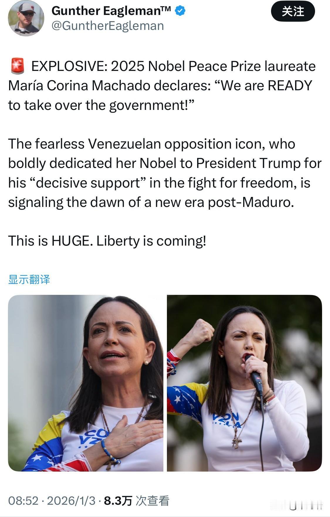 爆炸性消息:2025年诺贝尔和平奖得主玛丽亚·科琳娜·马查多宣布:“我们已准备好接管政府!” 这位无所畏惧的委内瑞拉反对派偶像大胆地将诺贝尔奖献给了特朗普总统,感谢他在争取自由的斗争中给予的“果断支持”,这标志着后马杜罗时代的曙光。