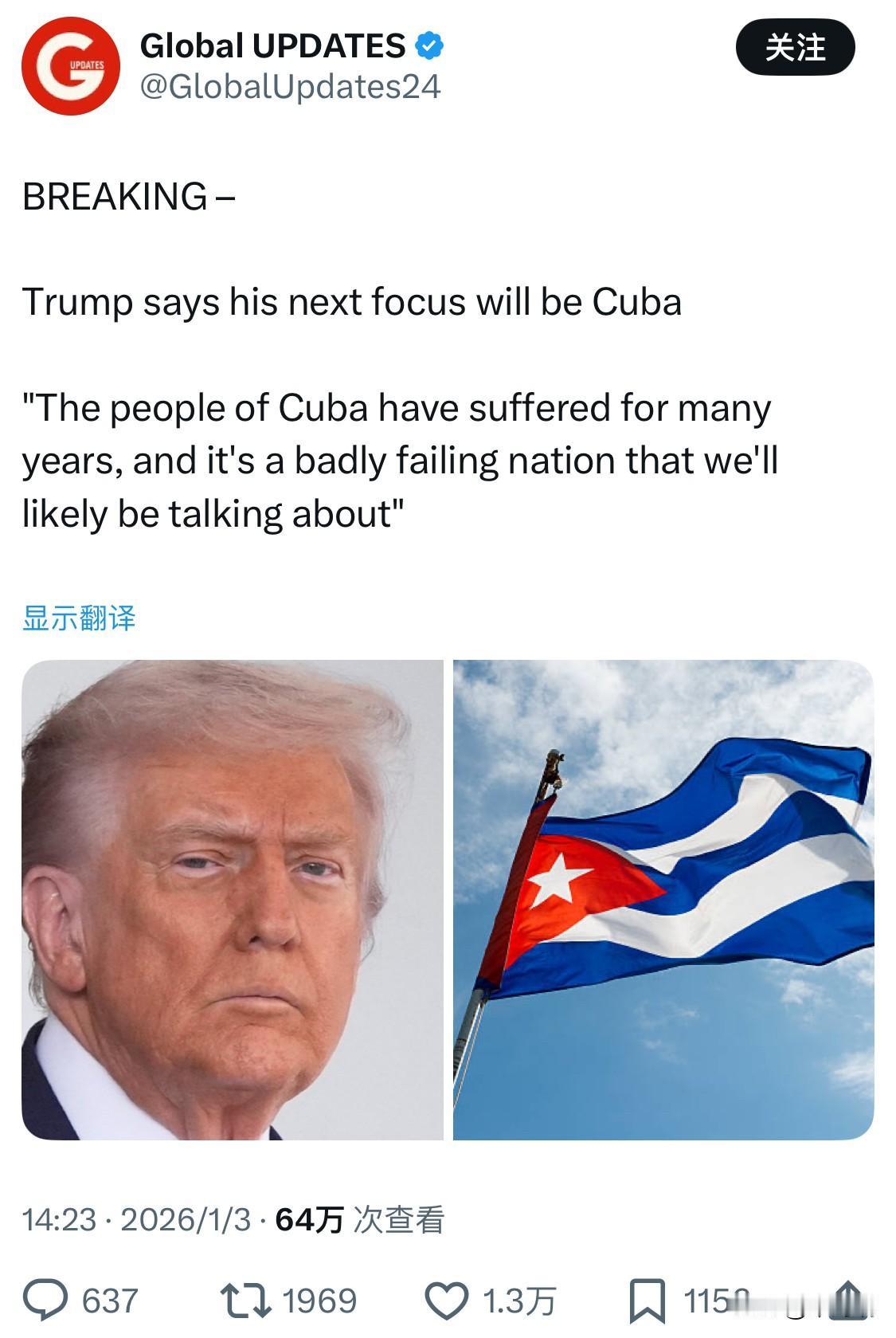 突发新闻:特朗普表示,他接下来的关注重点将是古巴。 “古巴人民多年来饱受苦难,我们很可能要谈论的就是这个严重衰败的国家。” 以上言论发表于2026年1月3日,正值美国在委内瑞拉采取军事行动并抓捕尼古拉斯·马杜罗(Nicolás Maduro)总统之后。 这些言论暗示美国在该地区的政策可能不仅限于委内瑞拉,国务卿马可·卢比奥(Marco Rubio)也表示,古巴政府应该感到“担忧”。 古巴严重依赖委内瑞拉的石油进口(占其稀缺石油进口量的约30%),并向委内瑞拉提供医疗人员以换取石油。委内瑞拉的变故可能对古巴产生连锁反应。