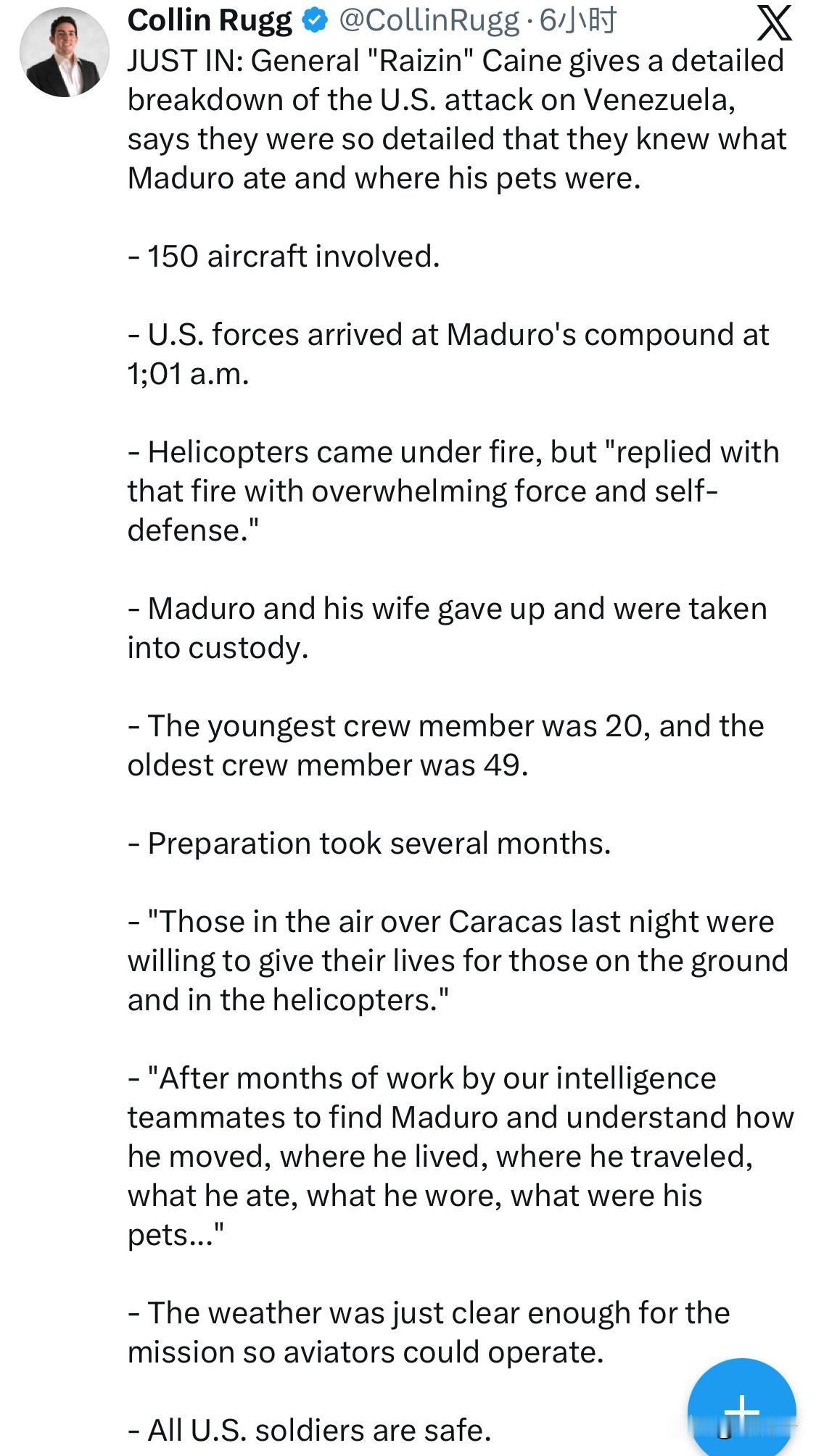 最新消息:美国参谋长联席会议主席凯恩将军(代号“雷辛”)详细分析了美国对委内瑞拉的袭击,称他们的行动非常细致,甚至知道马杜罗吃什么、他的宠物在哪里。 总计出动150架飞机。 美军于凌晨1点01分抵达马杜罗的住所。 - 直升机遭到炮火攻击,但“以压倒性的力量进行自卫还击”。 马杜罗和他的妻子投降了,并被警方拘留。 - 最年轻的船员20岁,最年长的船员49岁。 准备工作耗时数月。 “昨晚在加拉加斯上空的那些人愿意为地面上的人们和直升机上的人们献出生命。” “经过我们情报团队成员数月的努力,我们终于找到了马杜罗,并了解了他的行踪、居住地、旅行路线、饮食习惯、穿着打扮以及饲养的宠物……” 天气晴朗,足以执行任务,飞行员可以进行操作。 所有美军士兵都很安全。