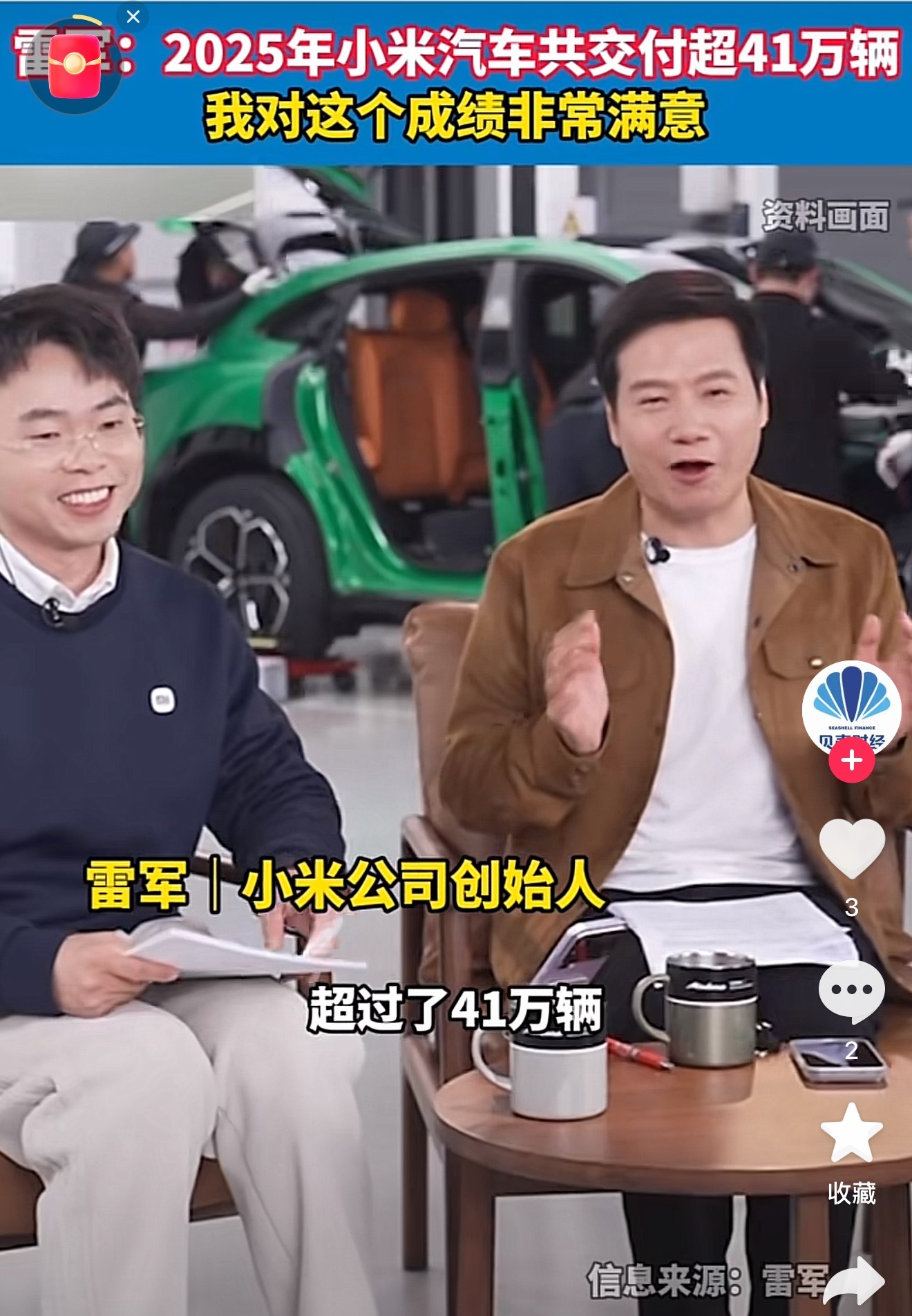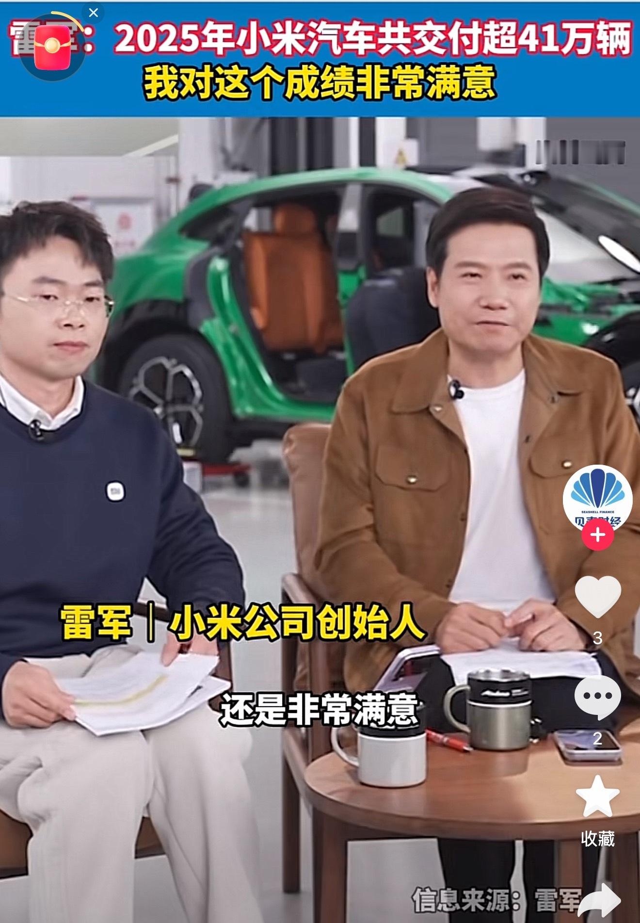 小米汽车25年交付超过41万 这个数字是真猛,从0到41万+,一年多时间,小米直接在新能源史上刷出存在感,交付速度堪称逆天。更牛的是,这41万不是低价冲量,而是均价不低、品质硬核的销冠成绩。在这么卷的车市里,小米还能一路狂飙,只能说明一个字——强!所谓“百万网友严选”,不是口号,是真金白银砸出来的口碑。身边买小米车的,基本都是年轻精英、科技发烧友,眼光毒得很,结果全被圈粉。SU7霸榜,YU7爆款,轿车和SUV双王齐立;产能、供应链爬坡飞快,制造功底稳到可怕。41万辆只是起点,照这个势头,真的很期待小米明年的新车,看它还能把车圈的天花板推到多高。 雷军公开小米汽车年交付量