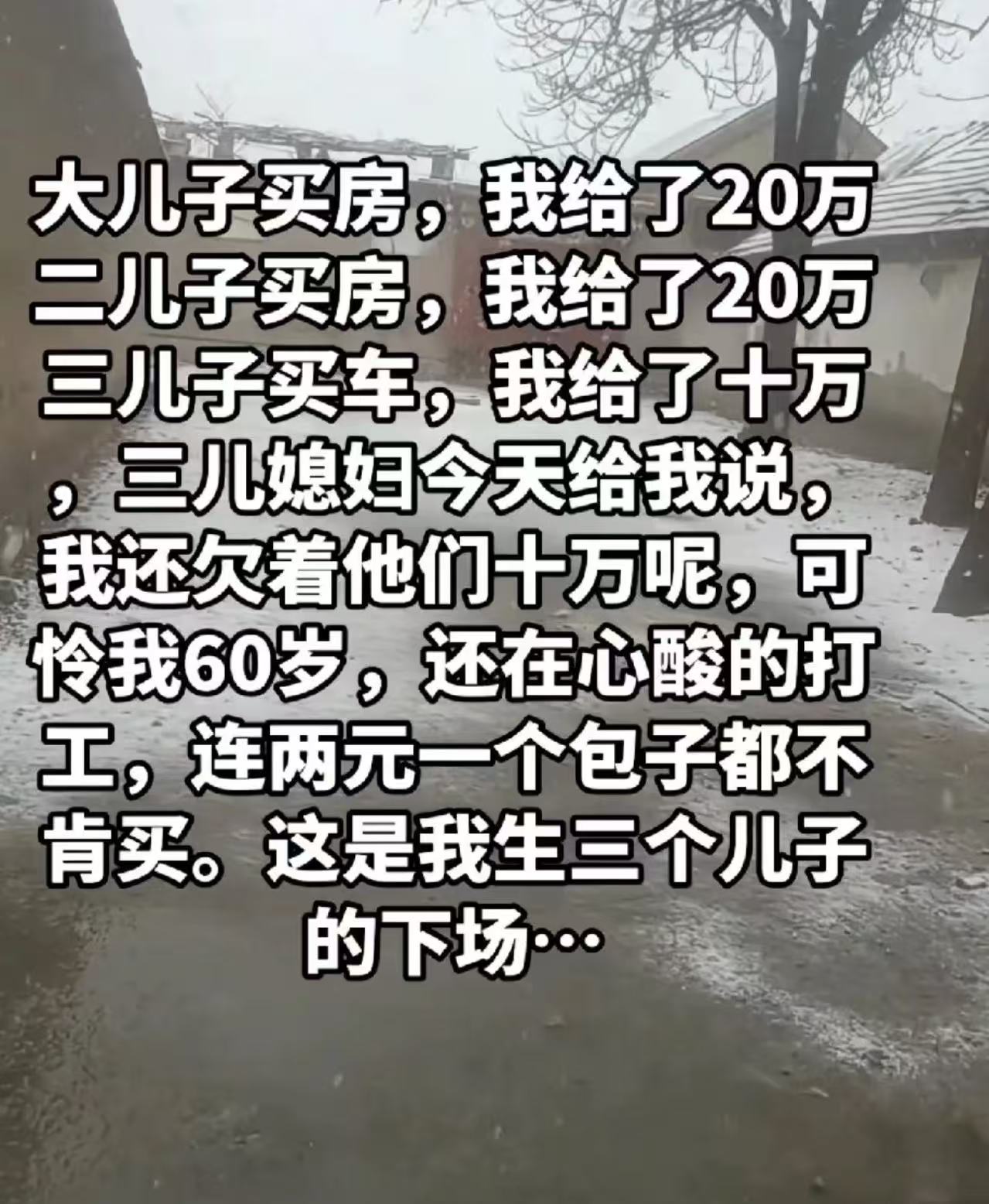 大爷无奈又心酸地说:“可怜我60岁的人了,还在外面辛辛苦苦地打工,每天累得腰酸背痛。就连那两元一个的包子,我都舍不得买,咬咬牙啃着自带的干粮。这就是我生三个儿子的下场啊……本来以为养儿能防老,现在才知道,养儿得养他们到老啊!”