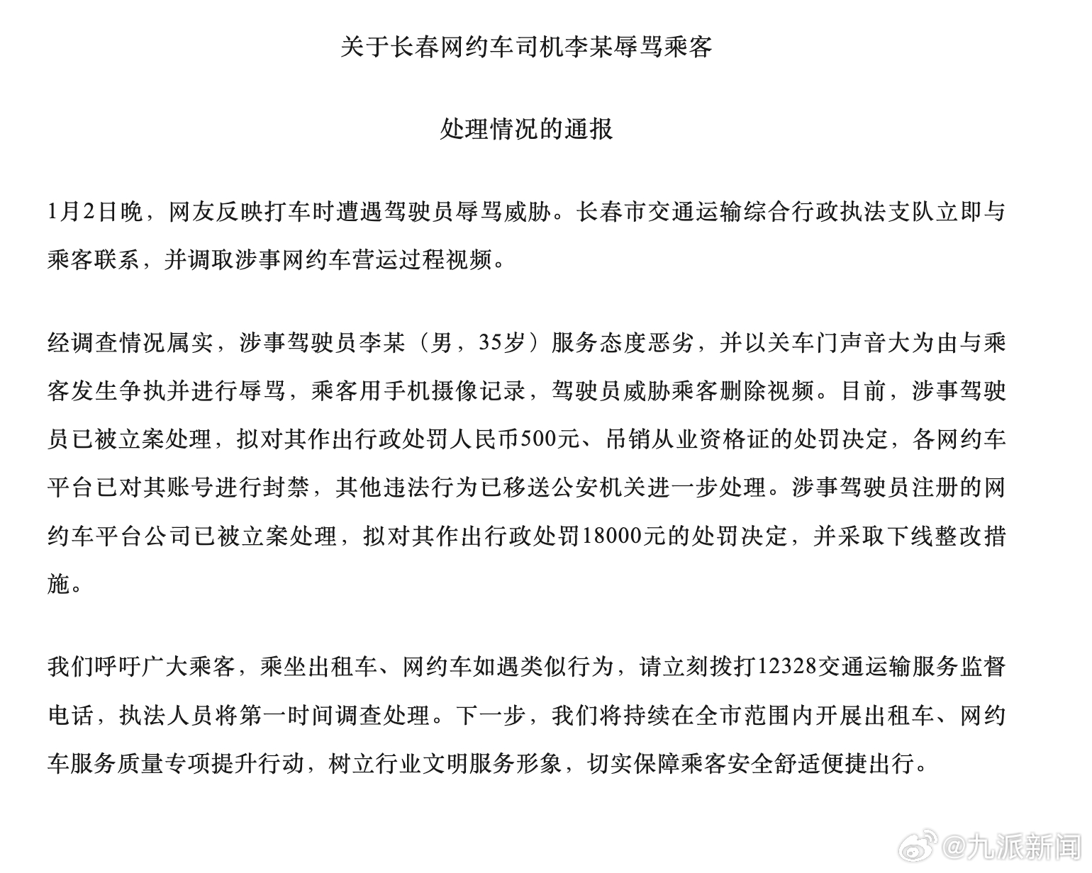#长春一网约车司机辱骂乘客被立案#【#官方通报司机因关门声大辱骂乘客#:涉事驾驶员已被立案处理,拟对其作出行政处罚人民币500元、吊销从业资格证的处罚决定】1月2日晚,网友反映打车时遭遇驾驶员辱骂威胁。长春市交通运输综合行政执法支队立即与乘客联系,并调取涉事网约车营运过程视频。经调查情况属实,涉事驾驶员李某(男,35岁)服务态度恶劣,并以关车门声音大为由与乘客发生争执并进行辱骂,乘客用手机摄像记录,驾驶员威胁乘客删除视频。目前,涉事驾驶员已被立案处理,拟对其作出行政处罚人民币500元、吊销从业资格证的处罚决定,各网约车平台已对其账号进行封禁,其他违法行为已移送公安机关进一步处理。涉事驾驶员注册的网约车平台公司已被立案处理,拟对其作出行政处罚18000元的处罚决定,并采取下线整改措施。