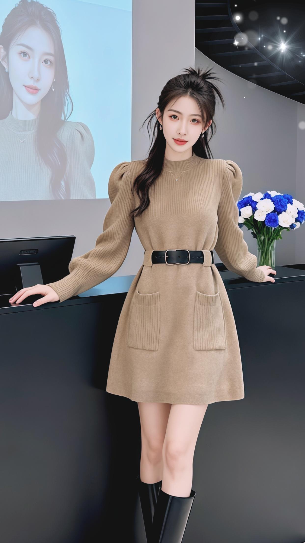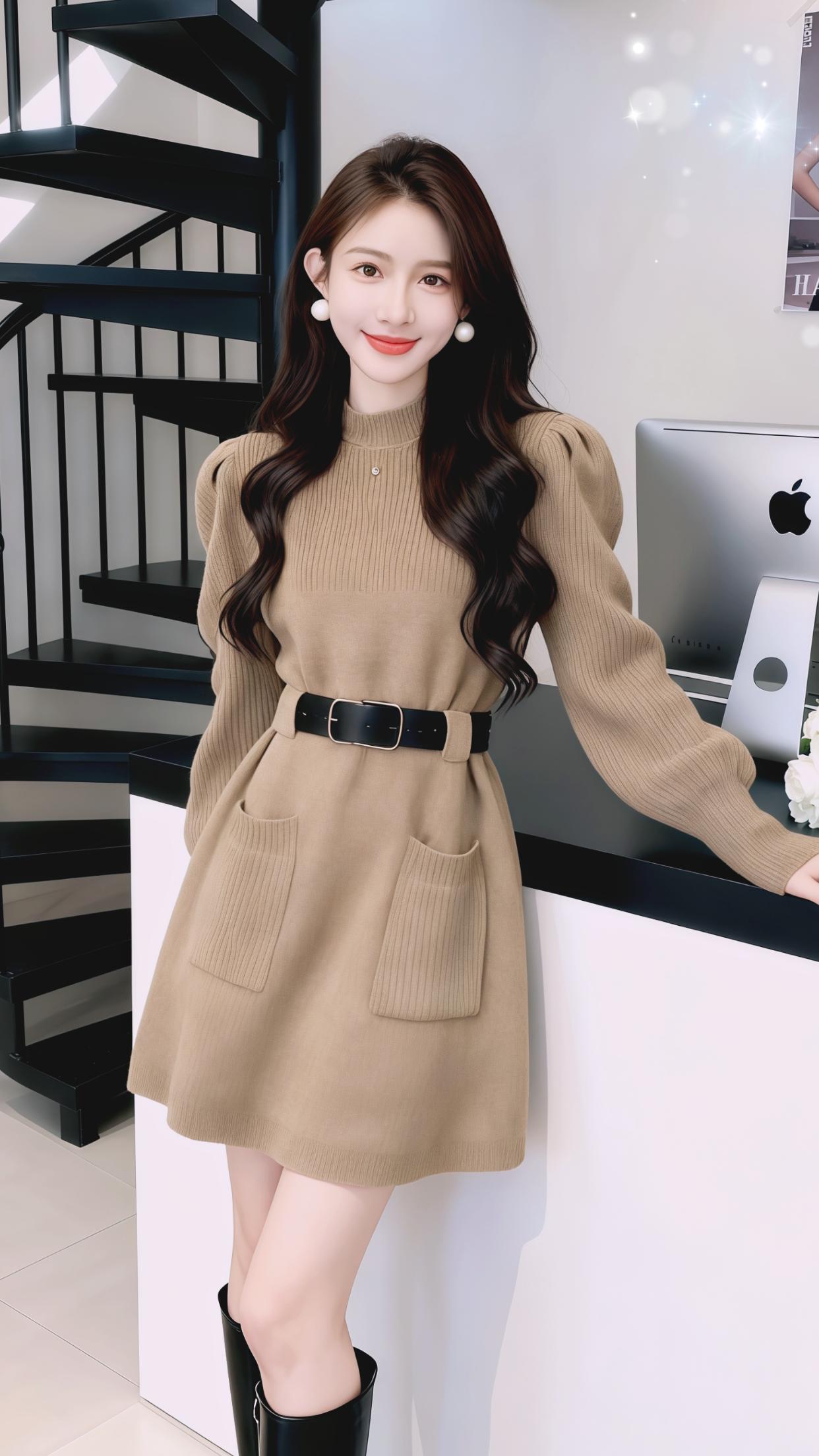 这套穿搭是浅卡其色修身针织高领上衣+同色系紧身长裤+裸色尖头高跟鞋的同色