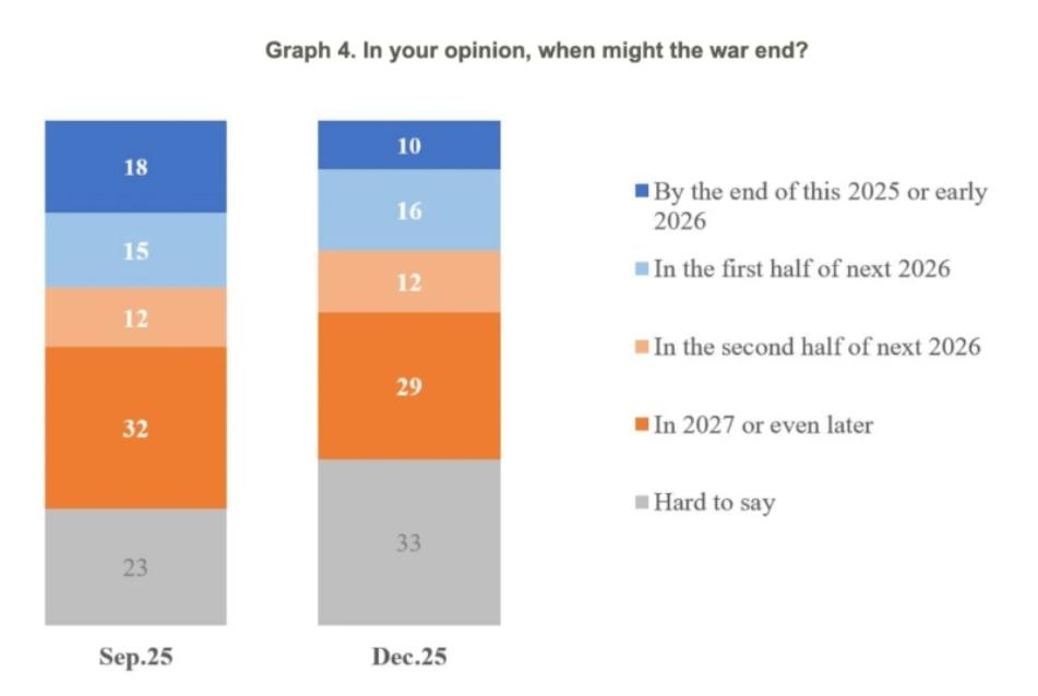 【最新民调:乌克兰人战争预期与和平方案倾向】基辅国际社会学研究所2025年11月26日至12月29日电话访谈1001名18岁及以上乌克兰人(政府控制区)开展民调。关于战争结束时间,29%预计2027年结束,33%表示“不知道”,仅约四分之一预计相对不远的将来结束。多数(62%)乌人表示必要时愿忍耐战争,14%提及6个月或几个月,无法回答者比例上升。 对于和平方案,74%认为俄方案完全不可接受,仅17%愿接受,俄方案含乌从顿巴斯撤军等敏感内容。69%乌人愿意支持欧洲与乌共同提出的和平计划,16%明确反对,表示“完全赞同”该计划的人数比例从18%升至30%。从地区看,各地区多数反对俄方案、支持欧乌联合方案。 这份民调反映出乌克兰民众在战争阴影下的复杂心态,对战争结束时间的不确定感,体现出局势的艰难与迷茫。在和平方案上,民众对俄方案高度抵制,对欧乌方案虽支持但热情有限,说明民众渴望和平,却也对不同方案充满疑虑。国际社会应重视乌民众诉求,推动公正合理和平进程。