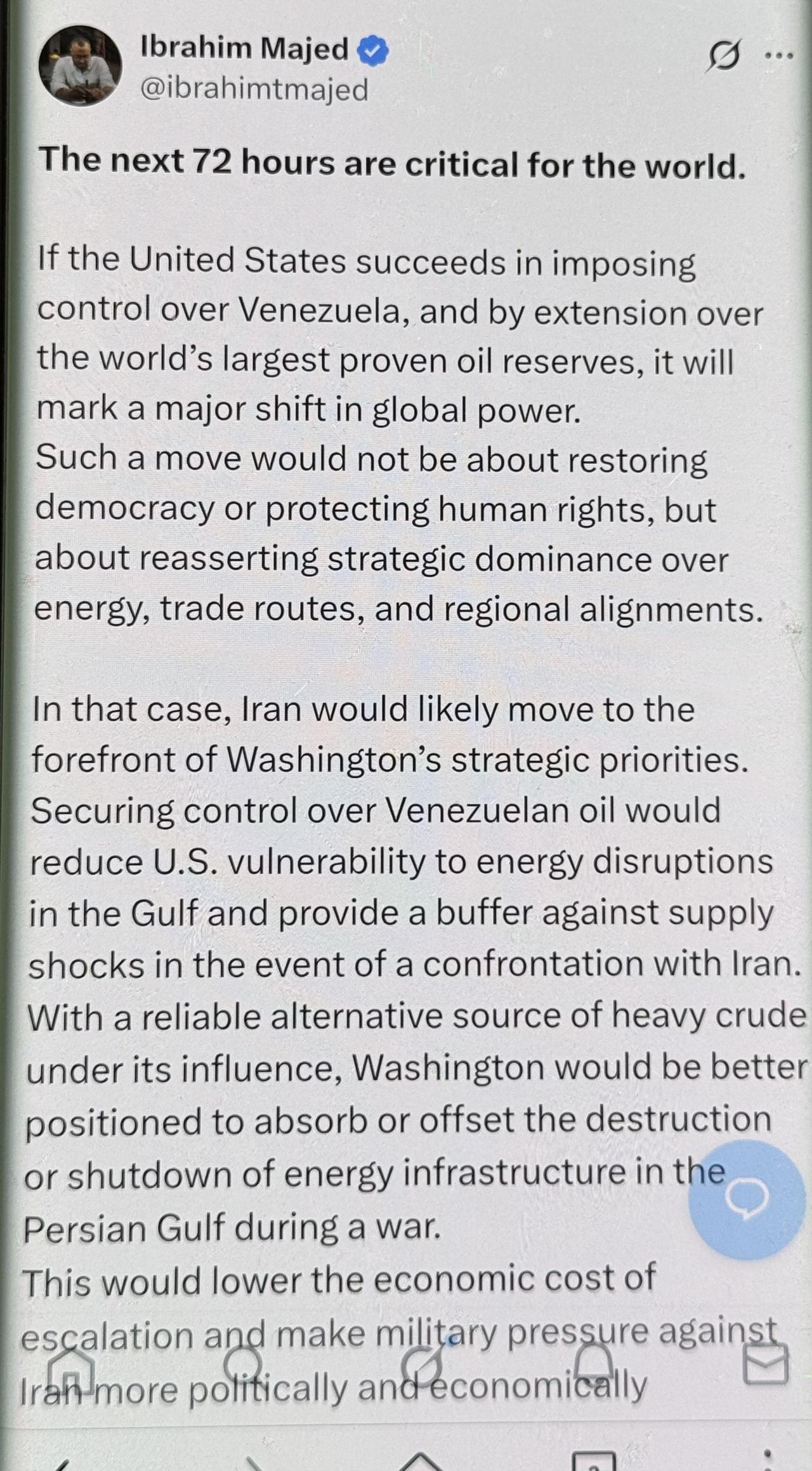 接下来的72小时对世界而言至关重要。 若美国成功掌控委内瑞拉,进而掌控全球已探明的最大石油储量,这将标志着全球权力格局发生重大转变。 此举无关恢复民主或保障人权,而是为了重新确立在能源、贸易航线及地区联盟中的战略主导地位。 委内瑞拉的石油储量有多惊人?已探明储量高达 3030 亿桶,占全球总储量的近五分之一,比沙特还多,是实打实的 “石油王国”。 更关键的是,它的石油类型是美国急需的重质原油,这种原油能提炼出更多柴油、船用燃料和沥青,正好补上美国本土产量的缺口。 而且委内瑞拉开采成本极低,有些项目每桶还不到 20 美元,比美国本土开采便宜太多,对美国的炼厂来说简直是 “香饽饽”。 现在就算受着美国制裁,委内瑞拉每天还能给美国出口 20 万桶原油,占美国从南美进口量的 27%。 美国心里比谁都清楚,掌控了委内瑞拉,就等于捏住了全球能源市场的 “命门”,以后油价高低、谁能买到油,都得看它脸色。 这种靠武力抢夺能源的套路,美国早就玩过了。2003 年,美国拿着一管疑似 “洗衣粉” 的东西,谎称伊拉克有大规模杀伤性武器,二话不说就发动了战争。 当时美联储前主席格林斯潘后来直言不讳:“所有人都知道,伊拉克战争本质就是为了石油。” 美军开进巴格达后,别的不管,先把油田和石油部守得严严实实,这就是最好的证明。 那场战争美国花了 3 万亿美元,死了 4400 多名士兵,却让伊拉克近百万平民丧命、数百万人流离失所。 可最后呢?美国并没真正掌控伊拉克石油,反而帮了死对头伊朗 —— 萨达姆政权倒台后,什叶派主导的伊拉克政府和伊朗越走越近,美国忙活半天,等于给伊朗打通了 “什叶派之弧”,竹篮打水一场空。 但美国没吸取教训,现在又把目光对准了委内瑞拉,因为它太需要通过控制能源来巩固霸权了。 更让人警惕的是,委内瑞拉的地理位置太关键了,它紧邻加勒比海,掌控着巴拿马运河周边的重要航道,这些航线是美洲乃至全球贸易的咽喉。 一旦美国控制了委内瑞拉,不仅能卡住南美各国的能源出口通道,还能把军事力量直接部署在美洲后院,压制那些不听话的国家。 这些年俄罗斯一直在帮委内瑞拉,给它提供了 S-300 防空系统、苏 - 30 战斗机,还有 “铠甲 - S1” 反无人机系统,就是为了帮委内瑞拉守住主权。 可美国不管这些,为了石油和霸权,就算引发大国对抗也在所不惜,这种霸道行径简直让人愤怒。 一旦美国得手委内瑞拉,下一个被盯上的肯定是伊朗,这是明摆着的事儿。伊朗的石油储量也排全球第四,高达 1560 亿桶,占全球 9.4%,而且它地处中东核心,掌控着霍尔木兹海峡,全球三分之一的石油运输都要从这里过。 对美国来说,掌控了委内瑞拉和伊朗,就等于控制了全球近三分之一的石油储量,石油美元体系就能稳如泰山。 要知道,美元之所以能全球通用,关键就是石油交易必须用美元结算。当年伊拉克萨达姆宣布用欧元结算石油,美国立马就动了手;现在伊朗也在推进非美元结算,这更是戳中了美国的痛处。 美国对伊朗的打压从来就没停过。2025 年 6 月,美国联合以色列对伊朗的核设施和导弹基地发动袭击,引发了 “十二日战争”;同年 11 月,美国特种部队在印度洋拦截了从中国运往伊朗的军事相关物资。 上个月,美国还在委内瑞拉海岸扣押了运往伊朗的油轮。这些动作都在说明,美国一直在为针对伊朗做准备。 现在伊朗的处境也确实艰难,受美国长期制裁,货币暴跌,1 美元能兑 142 万里亚尔,比 2022 年贬值了三倍多。 通货膨胀率高达 42.2%,食品价格涨了 72%,老百姓日子过得苦不堪言。美国就是想趁伊朗内忧外患的时候,一举拿下,彻底消除这个中东地区的 “心腹大患”。 美国的算盘打得精,可这种霸权行径根本行不通。当年伊拉克战争,美国看似打赢了,却输掉了国际信誉,“洗衣粉” 的谎言让全世界都看清了它的真面目。 接下来的 72 小时,每一分每一秒都充满了变数。美国的野心昭然若揭,它想通过掌控能源来主导世界,把别国的主权和人民的生命当筹码,这种做法既不道德,也注定会失败。 全球各国都应该警惕美国的冒险行为,霸权主义从来没有好下场,历史已经一次次证明了这一点。 委内瑞拉的石油是委内瑞拉人民的财富,伊朗的主权是伊朗人民的权利,任何国家都无权干涉和掠夺。 这 72 小时,不仅是委内瑞拉的生死关头,更是全球正义与霸权的较量。我们希望和平能战胜战争,主权能战胜侵略,毕竟没有哪个国家愿意被别人摆布,也没有哪个人民愿意生活在战乱之中。 美国如果执意一条路走到黑,最终只会搬起石头砸自己的脚,被全世界所唾弃。