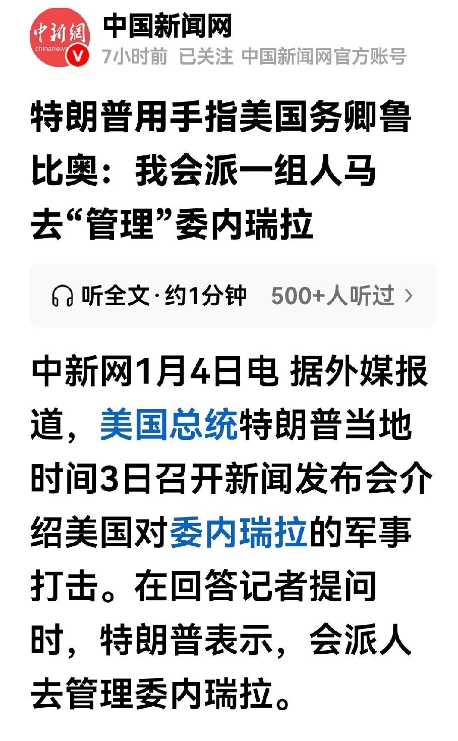 特朗普召开新闻发布会,他说他会派人去管理委内瑞拉。 美国成功抓捕了委内瑞拉总统马杜罗后,特朗普迫不及待的召开新闻发布会,当有记者提问,委内瑞拉该如何管理时,特朗普指着他身后的美国务卿卢比奥那群人说,这些人就是即将走马上任去管理委内瑞拉的人。 纽约时报曾预测过委内瑞拉副总统将接替马杜罗担任委内瑞拉新总统,这个说法好像也没有得到证实,这个木偶人最后由谁来担任,可能要看谁对美国最忠心,谁就可以做这个傀儡。 担任委内瑞拉新总统、美国支持的委内瑞拉反对派好像没有什么希望了,特朗普说,委反对派查理多影响力不大,没有得到委内瑞拉的民众支持,反对派马查多显然不合适。 反对派领袖马查多说委内瑞拉新总统应该由委总统选举时被排挤的埃德蒙多•冈萨雷斯来担任,但是特朗普已经表态,马查多的话也显得多余。 不知道委内瑞拉会不会引起新一轮革命潮?但有一点可以确定,美国已经决定在委内瑞拉建立傀儡政府,谁来担任委总统都一样,以后都是美国的传话筒。