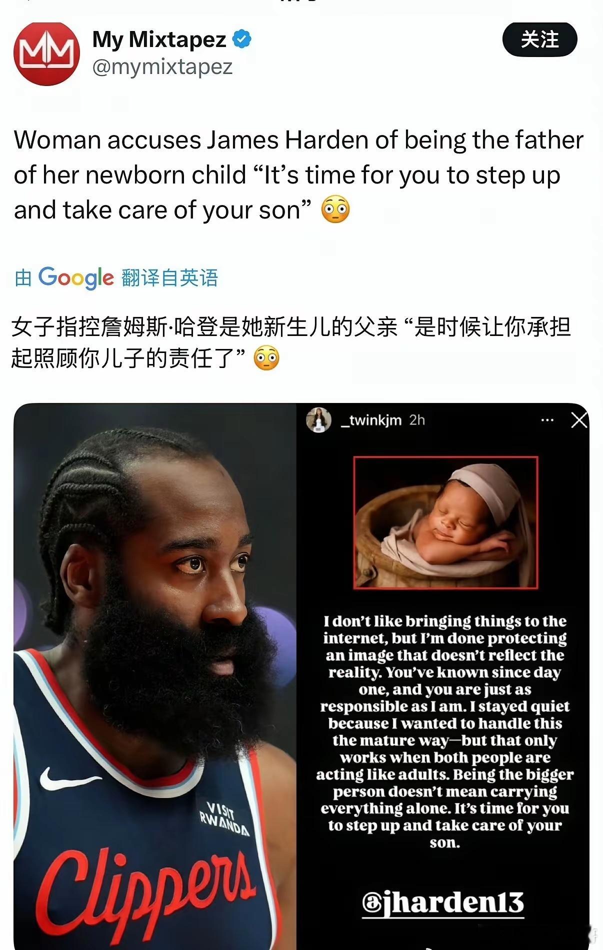 哈登很可能又摊上事了据媒体报道称一位叫做twinkjm的女子在社交媒体上喊话哈登,大致的内容为:“我并不喜欢将什么事都放在网上,但已经无力去维护一个和现实中截然不同的形象。不过从事情发生第一天哈登就应该明白,这是需要两人一起负责的事情。之前一直沉默,只是想要用更成熟的方式来处理事情,不过这样的前提,需要我们都像个成年人一样。所以成为“更成熟理智”的人,可不是需要一个人承担这一切,所以现在,是你该挺身而出,照顾你儿子的时候了。”对此,目前哈登方面还没有给出公开回应!nba快船哈登