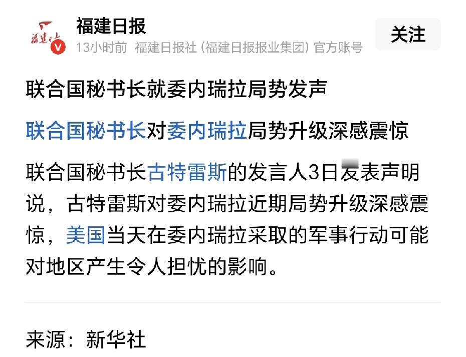 联合国秘书长就委内瑞拉局势发声:“深感震惊,但无能为力。” 这是国际法的悲哀,也是联合国的悲哀。 2026年1月3号,以后就可以称之为联合国和国际法的践踏纪念日。国际秩序在这一天荡然无存。 这就是一个潘多拉魔盒,被打开之后将会一发不可收拾。