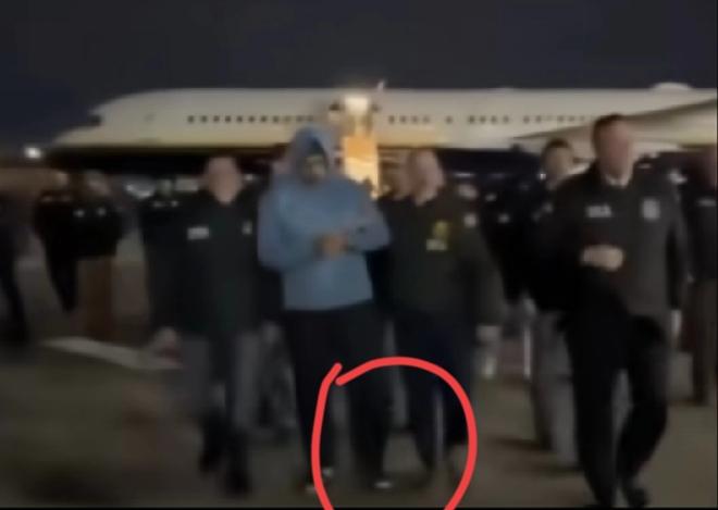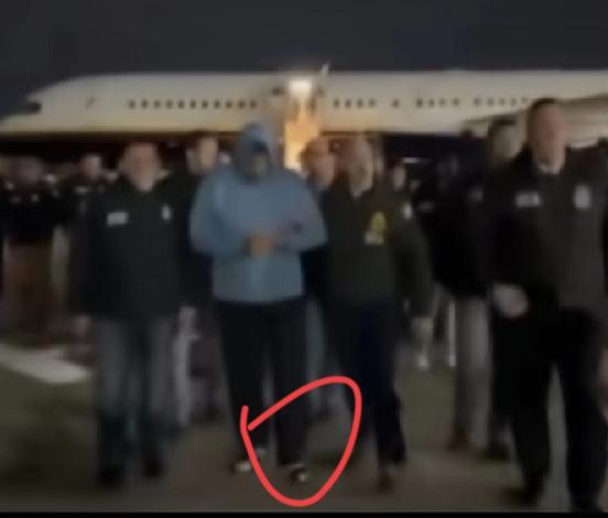 马杜罗的左腿怎么了?疑似受伤了,下飞机走路,提着左脚走,明显有点瘸,到了缉毒局上台阶,两个人架着才上去,不像是有网友说的,马杜罗个子高大,坐车腿坐麻木了,不能麻这么长时间,可见肯定受伤了,被枪击可能性大!被抓时发生了枪战,马杜罗想逃到钢门密室了,到门口了没进去,估计腿部被打中弹了!