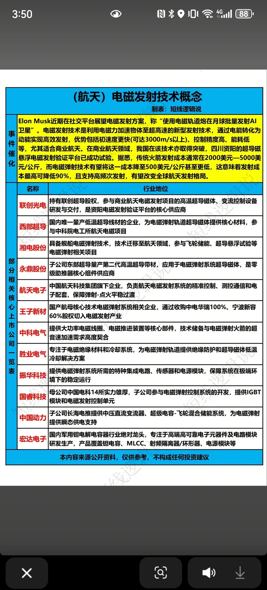1月4日,明日A股这个板块有望大涨!!! 马斯克近日在社交平台展望电磁发射方案,称“使用电磁轨道炮在月球批量发射AI卫星”,其优势包括初速度更快、控制精度高、能耗低等,将有效降低发射成本,改变全球发射格局,重点关注:联创光电、中科电气、国睿科技!!!