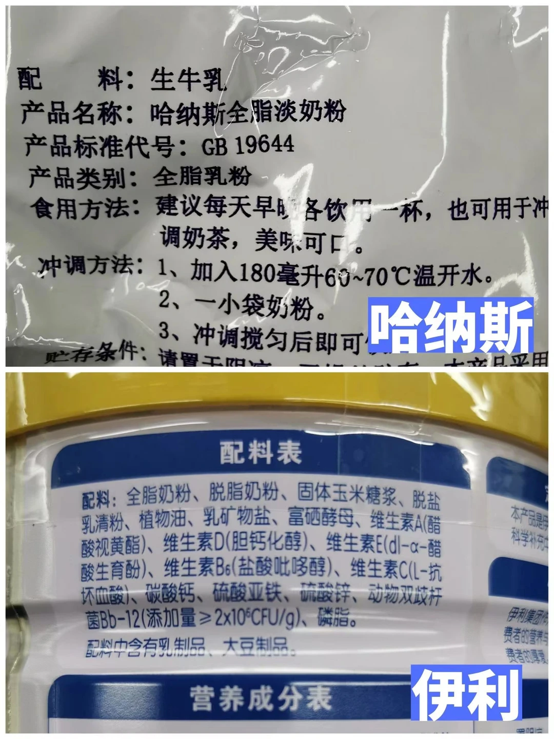 配料表优秀的:认养一头牛、哈纳斯