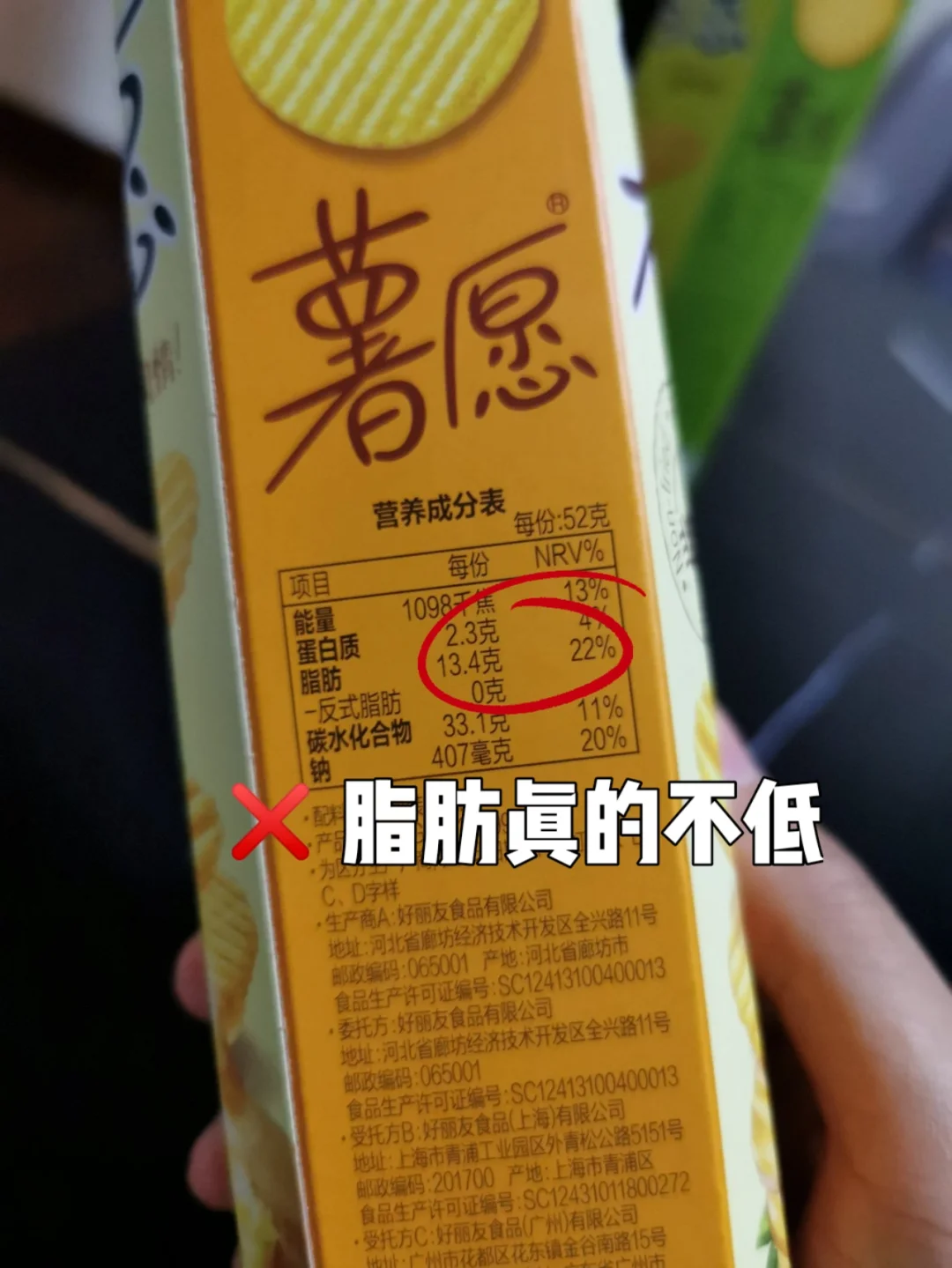仔细看配料表,一小包52g中含有13.4g脂肪,NRV22%
