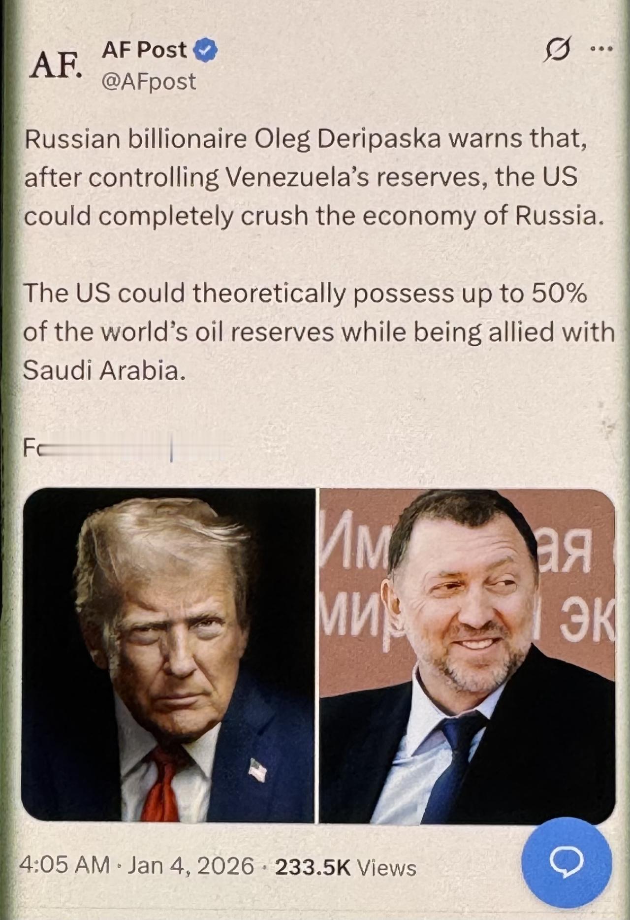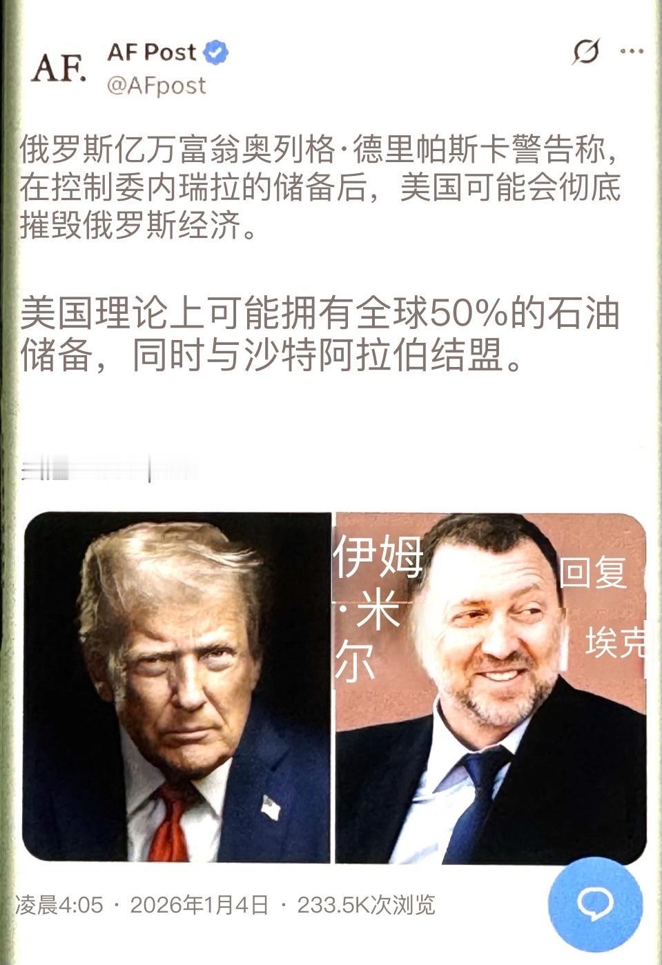 特朗普大棋局:俄罗斯亿万富翁奥列格·德里帕斯卡警告称,美国控制委内瑞拉的储备后,可能会彻底击垮俄罗斯经济。理论上,美国与沙特结盟后,有望掌握全球高达50%的石油储备。 这个判断绝非危言耸听。要搞懂其中逻辑,得先看清美国盯上委内瑞拉石油的核心诉求。委内瑞拉拥有全球第一的石油储量,已探明储量达3000亿桶,约占全球总量的17%。这些储量对美国来说有着不可替代的价值。 美国本土以生产轻质原油为主,这类原油主要用于制造汽油,用途相对单一。委内瑞拉的重质原油则能提炼出更多衍生产品,恰好弥补美国产能短板。更关键的是,美国大部分炼油厂都是按加工委内瑞拉石油的标准建设的,使用委内瑞拉原油的生产效率远高于本土原油。 特朗普政府近期的一系列动作都在印证这种觊觎。当地时间2026年1月3日,美国对委内瑞拉实施大规模军事打击,直接控制委总统马杜罗夫妇并移送出境。特朗普当天就公开宣称,美国将“管理”委内瑞拉,还会让美国大型石油企业进入,投入数十亿美元维修石油基础设施并创造收益。 在此之前,美国已通过多种手段施压委内瑞拉石油产业。美国以“缉毒”为借口,在委内瑞拉附近加勒比海域持续增兵。特朗普还下令扣押涉委内瑞拉油轮,对所有进出委内瑞拉的受美国制裁油轮实施“全面彻底的封锁”。 这种封锁已初见成效,受其影响,委内瑞拉主要石油储存设施及码头停泊的油轮正迅速装满原油,预计10天后就会达到最大储存上限,届时委内瑞拉国家石油公司可能被迫关闭部分油井。美国的步步紧逼,本质就是要逐步掌控委内瑞拉的石油储备,将其纳入自身能源体系。 再看美国与沙特的结盟动向。社交媒体曾疯传美沙50年石油美元协议到期不再续签的消息,这一说法已被证实为不实信息。事实上,1974年美沙签署的协议并未提及石油和美元,更没有50年的有效期。 当前美沙磋商的核心是防务协议,但能源合作始终是两国关系的重要纽带。沙特作为全球重要的石油生产国和出口国,其石油储量位居世界前列,2021年原油出口量达3.49亿吨,位居全球第一。 美国若能与沙特达成深度能源结盟,再加上已逐步掌控的委内瑞拉石油储备,理论上确实有可能掌握全球高达50%的石油储备。 这种掌控力绝非单纯的资源占有,而是对全球石油定价权和供应链的绝对主导。全球石油贸易长期以美元结算,美国通过掌控核心储备,能进一步巩固石油美元体系,让全球能源交易更依赖美元,从而强化自身金融霸权。 这一切对俄罗斯经济的冲击将是致命的,德里帕斯卡的警告有着坚实的经济逻辑支撑。能源出口是俄罗斯经济的命脉,油气出口收入长期占据俄罗斯财政收入的半壁江山。 2021年,俄罗斯油气出口收入约1650亿美元,占当年财政收入的49.86%;燃料和能源产品出口占总出口的54.3%。 即便近年来俄罗斯努力推动能源出口多元化,降低对西方市场的依赖,2024年上半年油气收入仍达5.698万亿卢布,同比增长68.5%,对联邦预算的支撑作用依然显著。 国际原油价格的波动直接决定俄罗斯经济的走向。数据显示,石油价格每桶下降10美元,俄罗斯就会损失324亿美元,约等于1.6%的GDP。 美国一旦掌控全球50%的石油储备,就能通过调整产量和出口规模随意操控国际油价。美国完全可以通过大幅增加石油供给压低油价,让俄罗斯油气出口收入锐减。 2014年油价暴跌就曾导致俄罗斯经济大幅受损,卢布相对美元累计贬值74%,当年11月通胀率飙升至9.1%,远超预期目标。 更严峻的是,美国掌控全球主要石油储备后,会进一步挤压俄罗斯的能源出口市场。俄罗斯当前已将部分原本流向欧洲的石油转向印度等国,同时努力恢复对欧洲的天然气出口。 但美国主导的石油体系会形成垄断效应,让更多国家选择从美国控制的渠道进口石油,俄罗斯能源出口的市场份额将被持续压缩。 一旦出口量和价格同时下滑,俄罗斯财政收入会大幅缩水,企业利润被挤压,固定资产投资减少,进而引发一系列经济连锁反应。 德里帕斯卡的身份让这份警告更具分量。他是俄罗斯铝业公司创始人,曾跻身全球富豪行列,2018年就被美国列入特别指定国民名单,其在美国司法管辖范围内的财产被冻结,美国公民和实体被禁止与他进行任何交易。 他亲身经历过美国制裁的威力,对美国通过经济手段打压俄罗斯实体和个人的套路有着深刻认知。他的判断不仅基于经济数据,更源于对美国地缘政治手段的了解。 特朗普政府的能源战略带有鲜明的“资源帝国主义”色彩。英国《卫报》就曾指出,美国对委内瑞拉的攻势延续了其惯用套路:以安全为借口指控、推行政权更迭、觊觎石油利益。 特朗普本人多次公开表示,美国应通过控制他国资源来弥补自身投入,甚至曾呼吁夺取伊拉克石油“补偿”战争成本。 这种思维主导下,美国对委内瑞拉石油的控制和与沙特的结盟,都是其全球资源争夺战略的重要环节。