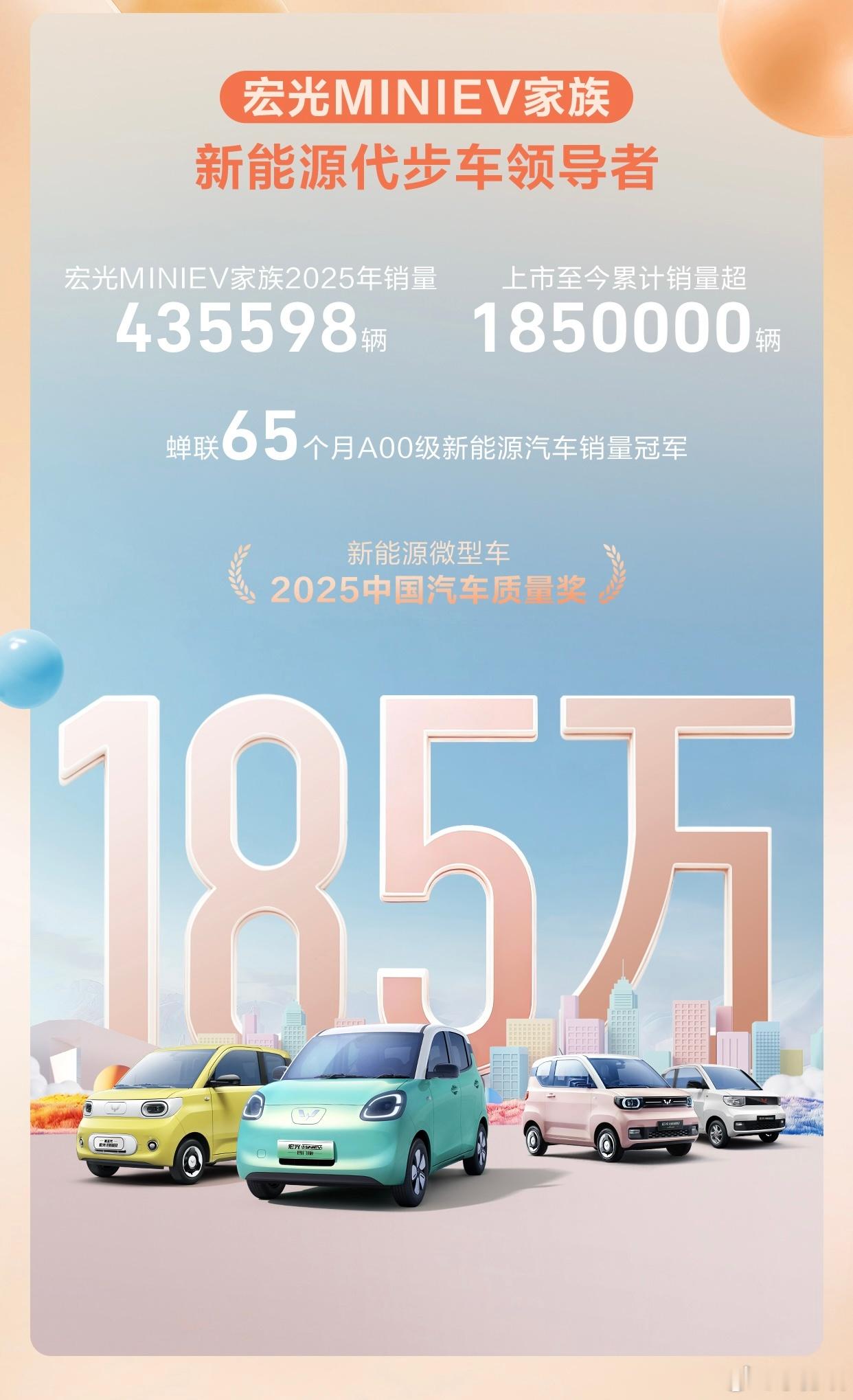 销量冠军再续传奇!宏光MINIEV家族2025年热销435598辆,累计突破185万宏光MINIEV2025年,宏光MINIEV家族以持续领先的市场表现,全年热销435598台,累计销量突破185万辆,连续65个月蝉联A00级新能源汽车销量榜首,稳居全球微型新能源汽车累计销量的冠军宝座!如今,在中国每卖出两台微型代步车,就有一台是宏光MINIEV,这不仅是一款现象级产品的成功,更是中国新能源代步车普及路上的重要里程碑。