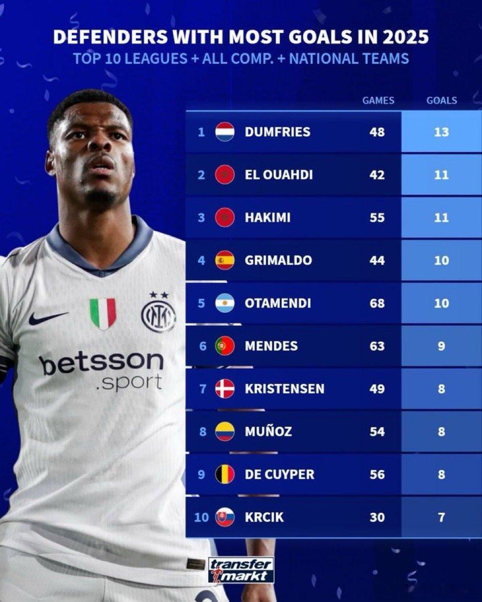 2025年进球最多的后卫球员排名如下国际米兰亚特兰大0比1国际米兰热点现场 邓弗里斯居首