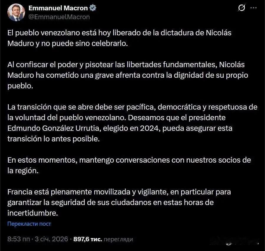 装都不装了,西方已经亮出“獠牙”开始“狩猎”拉美及中东国家了 法国总统马克龙在美国突袭并抓走委内瑞拉总统马杜罗后称“应该让委内瑞拉反对派政客埃德蒙多·冈萨雷斯·乌鲁蒂亚出任委内瑞拉元首”,现在西方真的是装都不装了,一个国家的元首都不需要经过选民投票选举了,而是西方政府直接任命了。 从此次美国突袭抓走马杜罗来看,西方已经亮出“獠牙”开始“狩猎”拉美及中东的国家了。所以现在才是丛林法则的开始,想要不变成猎物就要自身足够强大。