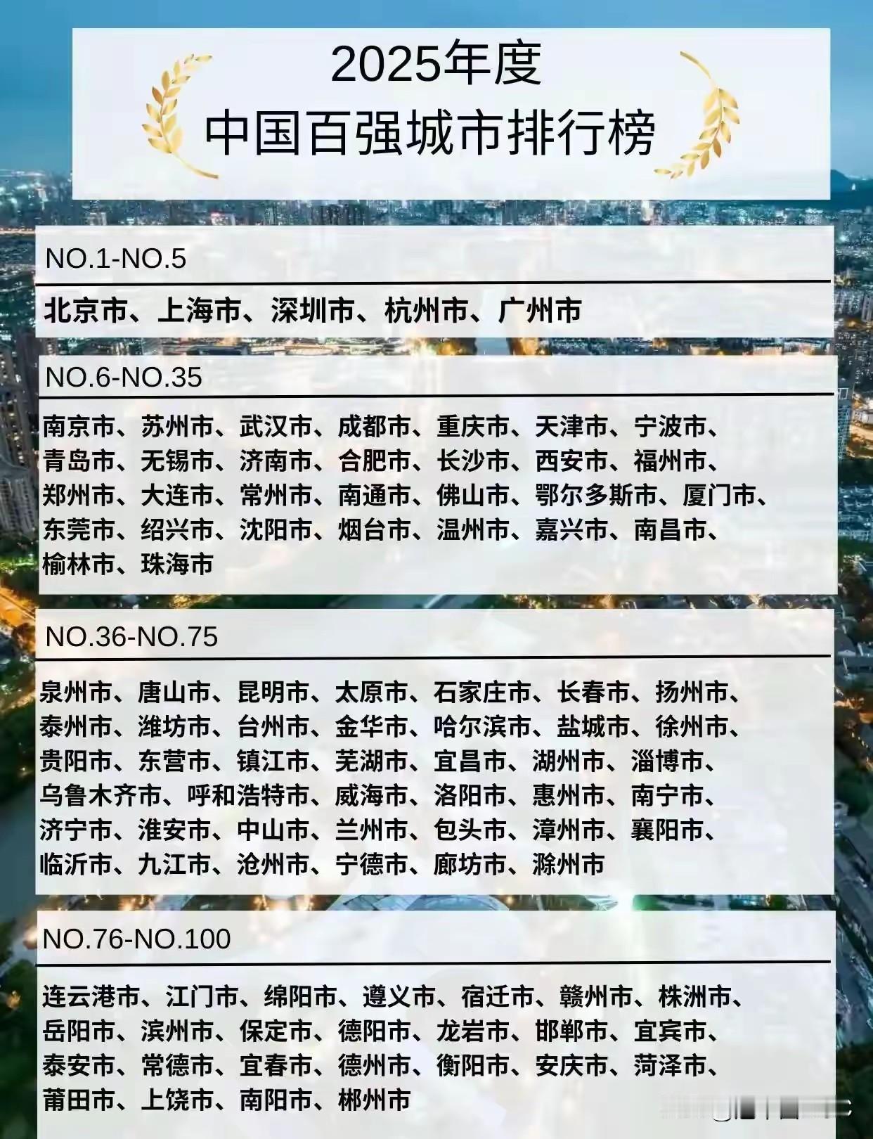 北上深杭广!2025城市新格局定了,杭州这次真的闯进一线了? 最新发布的2025中国百强城市榜,最大的看点不是谁排第一,而是第四把交椅换人了——杭州硬生生把广州挤到了第五,新格局“北上深杭广”正式出炉。 仔细看榜单,北京、上海地位稳如泰山,深圳老三的位置也没动摇。真正的“变局”发生在第四名的争夺上。杭州这次能上位,靠的绝不只是西湖美景和电商之都的名头。 有人说,这是数字经济对传统商贸的一次“超车”。杭州靠着阿里巴巴、网易这些巨头打下的数字化底子,在云计算、人工智能、直播电商这些新赛道上跑出了速度。而广州,作为千年商都,实力当然雄厚,但在衡量城市综合实力的新算法里,“互联网+”的权重似乎越来越高。 这份榜单也透露出城市竞争的新逻辑。光有经济总量不够,还得看增长的后劲、产业的锐度和人才的吸引力。杭州就像一个“新锐”,虽然体量未必最大,但势头猛、话题足、年轻人爱去。广州则像一位“底蕴深厚的高手”,只是在这一轮以创新和流量为核心的评比中,节奏稍慢了一拍。 不过,排名只是瞬间的定格。广州的根基、交通枢纽地位和全面产业体系,依然是顶级的。杭州的异军突起,更像是给所有城市提了个醒:在这个快速迭代的时代,没有永恒的座次,只有不断的奔跑。 “北上深杭广”的新格局,或许正是中国经济动能转换的一个缩影。下一个五年,榜单还会怎么变?好戏,可能才刚刚开始。