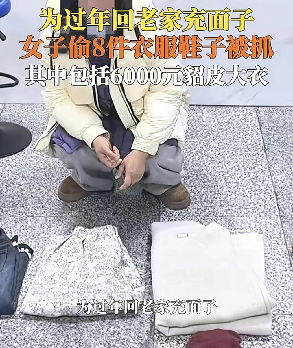 湖南株洲一女子为了过年回家在亲戚面前有面子,在逛服装店的时候偷走8件上衣和鞋子,其中还包含了价值6000块钱的貂皮大衣,最终店主报警,女子被抓获,审讯时女子称为了在亲戚面前能够炫耀,这下子是一点面子都没有了,人们总是为了不值钱的面子,做一些无意义的事,甚至是走上犯罪的道路。