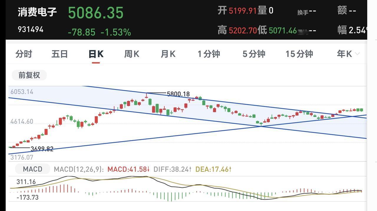 基金:消费电子板块可不可以继续持有 消费电子板块去年的走势也是中规中矩,全年上涨了45.22%,最近一段时间也是横盘震荡偏向于上的走势。 这个板块加仓排行榜见下面的截图3,持有人数排行榜见下面的截图4,排名第一的都是易方达消费电子。 我们来看一下下面的截图5,这是消费电子板块日K线图,从图中可以看出,我画了两条倾斜向下的斜线,这是消费电子板块日线级别下跌通道,前段时间突破了这个下跌通道的上轨,形成了新的短期上涨趋势,我画的那条倾斜向上的斜线,就是消费电子板块日线级别短期上涨趋势线,持有的人可以继续持有,除非跌破这条上涨趋势线才,可以考虑要不要止盈出来观望。 我们来看一下下面的截图6,这是消费电子板块周K线图,从图中可以看出,我画了一条倾斜向上的斜线,这是消费电子板块周线级别上涨趋势线,现在的位置处于这条上涨趋势线之上,持有的人可以继续持有,除非跌破这条上涨趋势线,才可以考虑要不要止盈出来观望。 消费电子板块日线级别处于短期上涨趋势中,周线级别也是处于上涨趋势中,持有的人可以继续持有。 我每天都会分享我的观点,我的观点只代表我个人的看法,不能作为你操作的依据,据此操作后果自负。