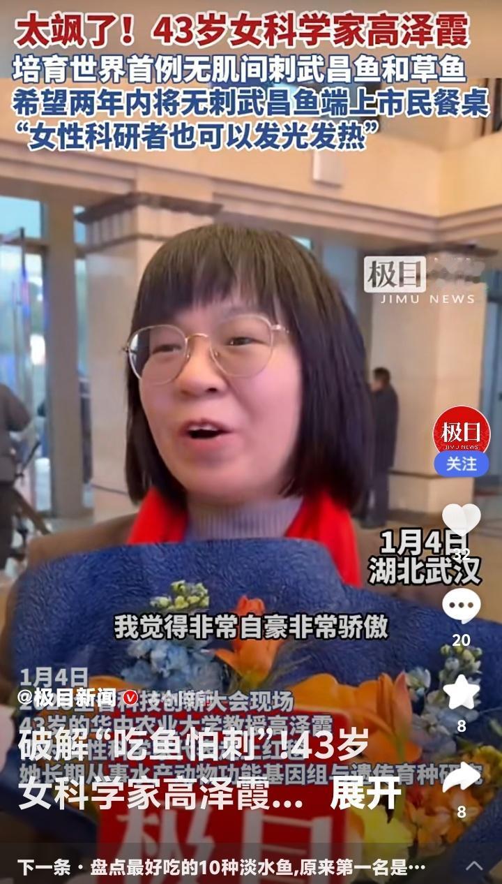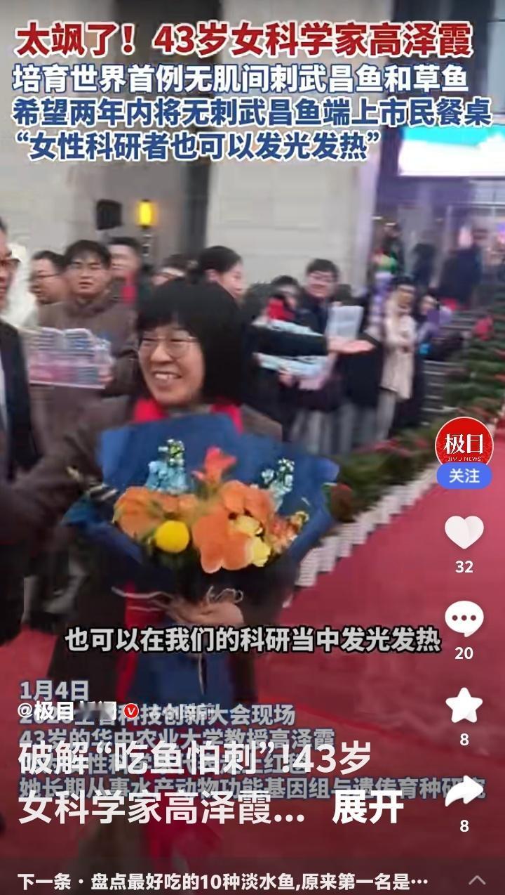 湖北武汉传来颠覆性喜讯!43岁女科学家高泽霞十年磨一剑,全球首例无刺武昌鱼即将上桌,吃鱼自由时代真的来了! 还记得小时候被鱼刺卡喉的恐惧吗?那种吞饭喝醋的狼狈,跑急诊室的慌张,成了多少人餐桌上的阴影。但今天,这一切将被彻底改写。一位来自湖北武汉的女科学家,用十年青春和智慧,为我们端上了一盘没有肌间刺的武昌鱼。 她就是华中农业大学教授高泽霞。在刚刚落幕的湖北省科技创新大会上,她携着世界首例无肌间刺武昌鱼和草鱼的成果,自信地踏上了科学家红毯。这不仅仅是一项科研突破,更是对亿万食客“吃鱼怕刺”这一千年困扰的温柔回应。 消息一出,网络瞬间沸腾。有人欢呼“吃货的春天”,也有人质疑“违背自然”。但你知道吗?这项成果的背后,绝非简单的“去除”,而是一场在基因层面进行的精密“编辑”。高泽霞团队找到了控制肌间刺生长的关键基因,如同掌握了鱼刺的“生长密码”,从生命源头解决了问题。 这并非转基因,而是分子设计育种。就像我们吃的无籽西瓜、饱满的水稻,都是人类智慧对自然作物的优化。高泽霞团队的成果,实现了种质资源完全自主可控,是全流程国产化的硬核科技。它让鱼肉回归纯粹的鲜美,让营养摄取变得安全无忧。 站在红毯上,高泽霞的激动溢于言表。她将湖北的创新环境比作沃土,而她的团队,正是那颗破土而出的种子。更让她自豪的是,她代表了无数在实验室里默默耕耘的女性科研工作者,用实力证明“女性同样可以在科研中发光发热”。 面对“何时能上餐桌”的热切追问,高教授给出了乐观的预期:两年内。虽然仍需完成安全评价等流程,但曙光已现。想象一下,不久的将来,我们可以放心地大快朵颐鲜美的清蒸武昌鱼,老人孩子都能安心享用,这是多么温暖的画面。 每一项改变生活的科技诞生时,总伴随争议。但科技的善意,终将体现在寻常百姓的餐桌上。高泽霞和她的无刺鱼,戳中的正是我们最朴素的愿望——安心吃好每一顿饭。这不仅是舌尖的解放,更是中国科研脚踏实地、为民解忧的生动写照。 从武汉的实验室到未来的百姓餐桌,这条无刺鱼游过的,是一条中国科学家用创新与坚持开辟的航道。它承载的不仅是口腹之欲的满足,更是国家对民生科技的高度重视,是女性力量在硬核领域的璀璨绽放。让我们期待,这条鱼早日游进千家万户。 (来源:综合自极目新闻、凤凰网等媒体报道) 吃鱼自由 科技改变生活