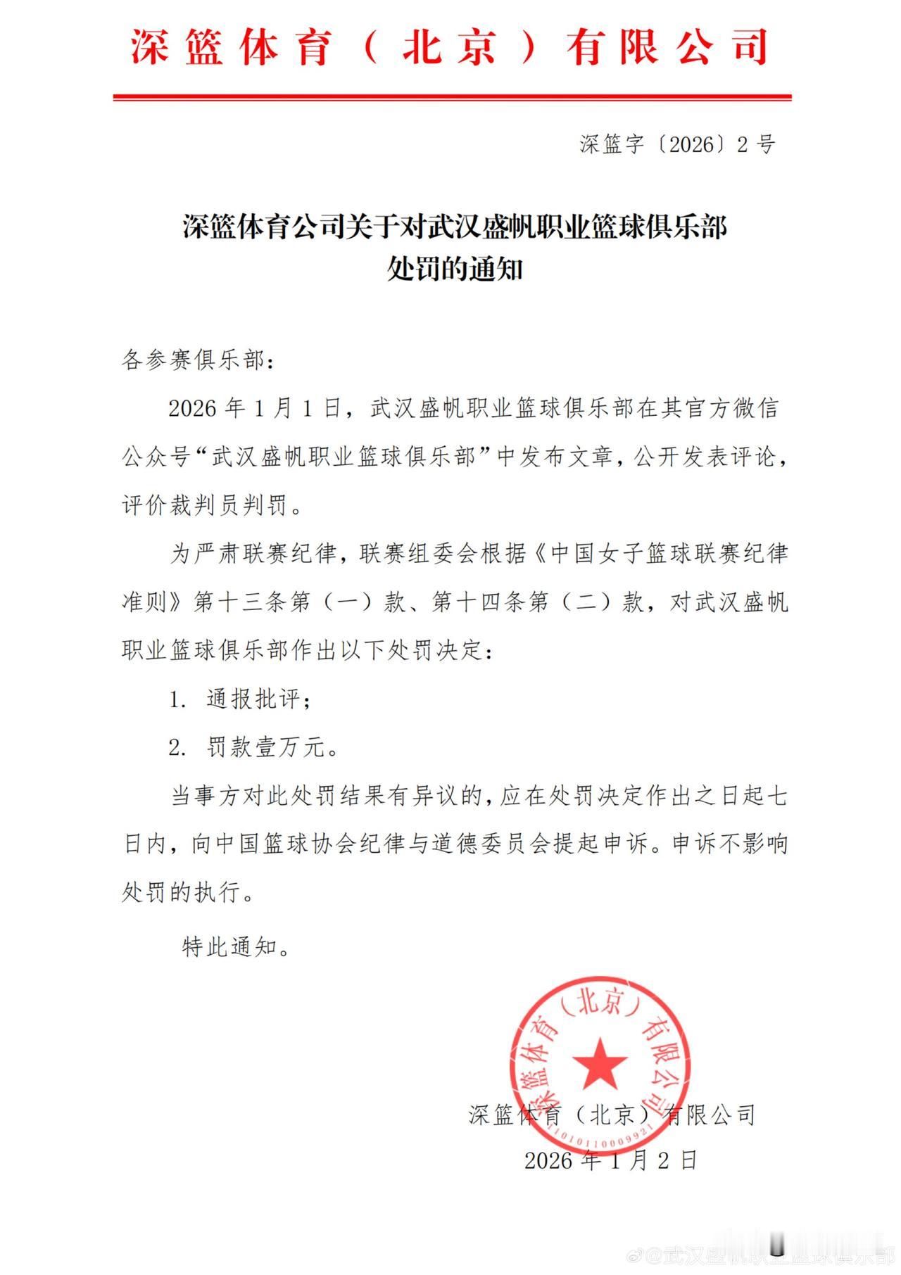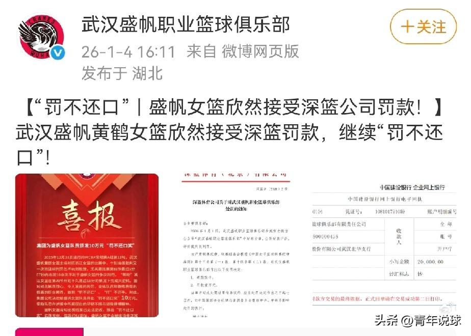 武汉盛帆女篮俱乐部真硬气啊! 联赛运营公司深蓝体育作出一万元的罚款处理,武汉盛帆女篮俱乐部直接缴纳两万元的罚款,然后继续公开发文,继续高喊“罚不还口”的口号,继续为球员遭受的不公正判罚发声,大有一种“你随便罚,我有的是钱,但我就是要一个公道”的气势,这是抱着硬刚到底的决心。深蓝体育应该妥善处理俱乐部遇到的不公正判罚的问题,而不是继续追加罚款,继续追加处罚,这样只会让事态愈演愈烈,最终一发不可收拾,又成了一个国内篮球界的一个大笑话。