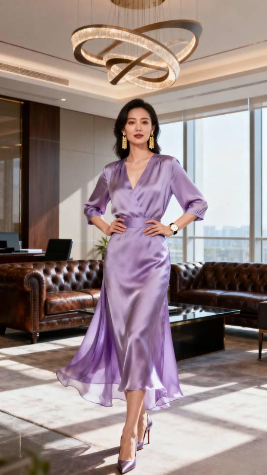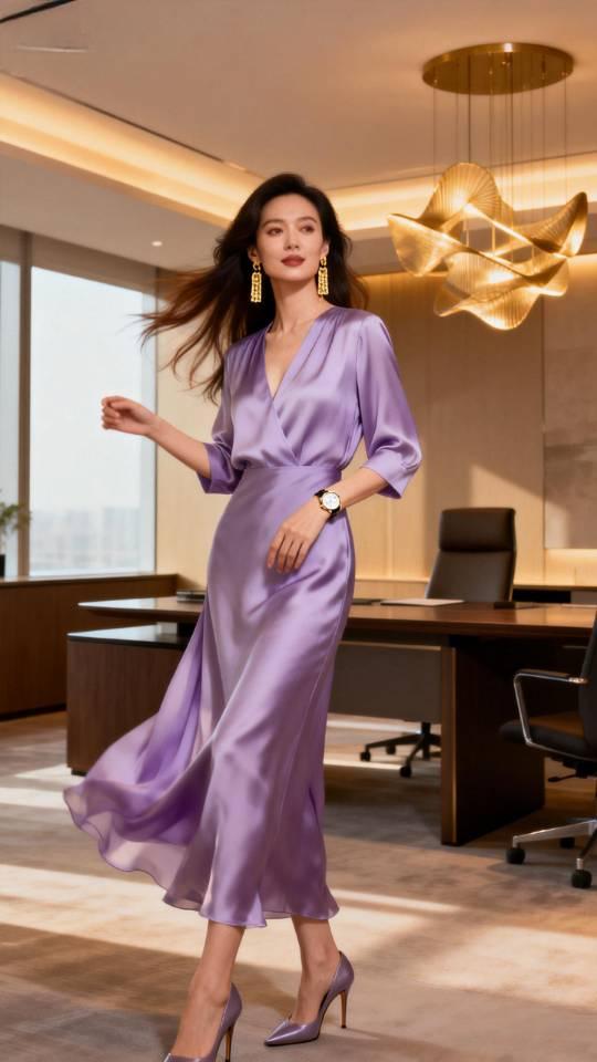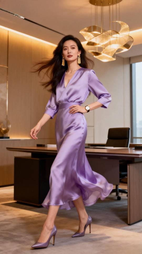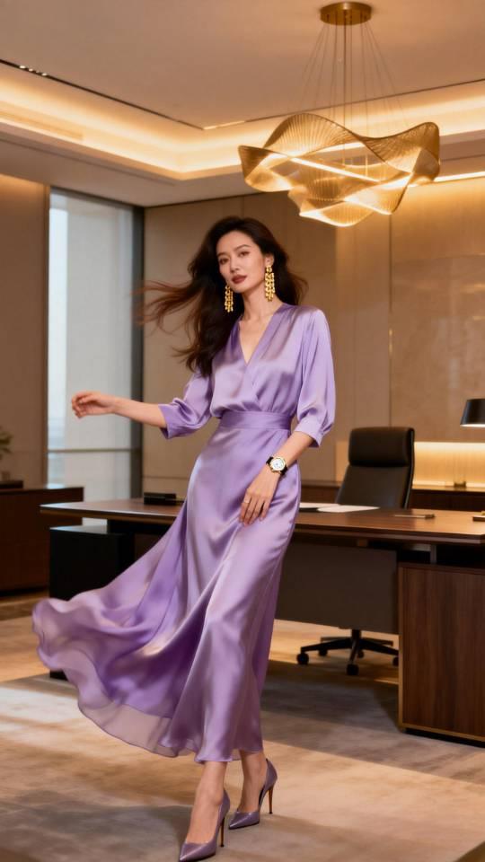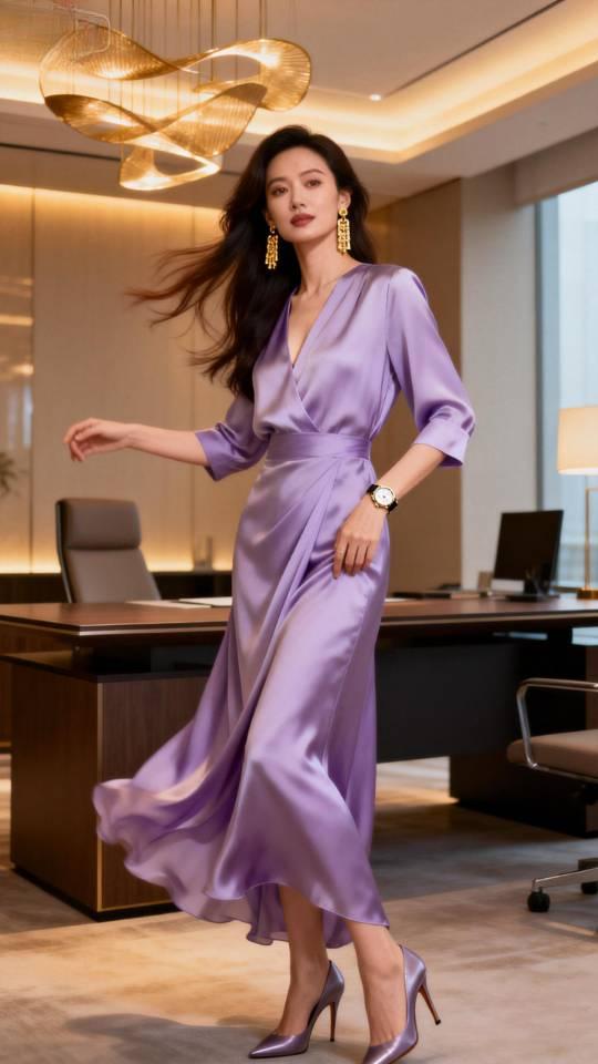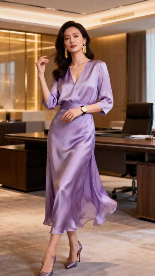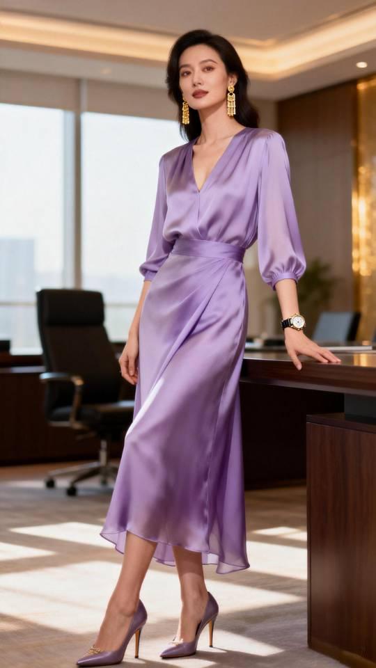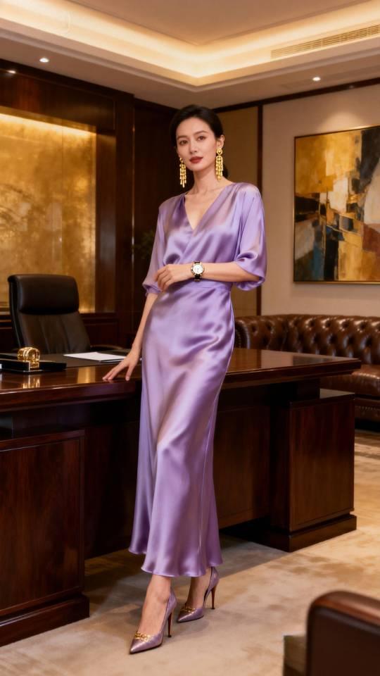身穿紫色丝绸连衣裙女子办公间摆拍。连衣裙 高清美女